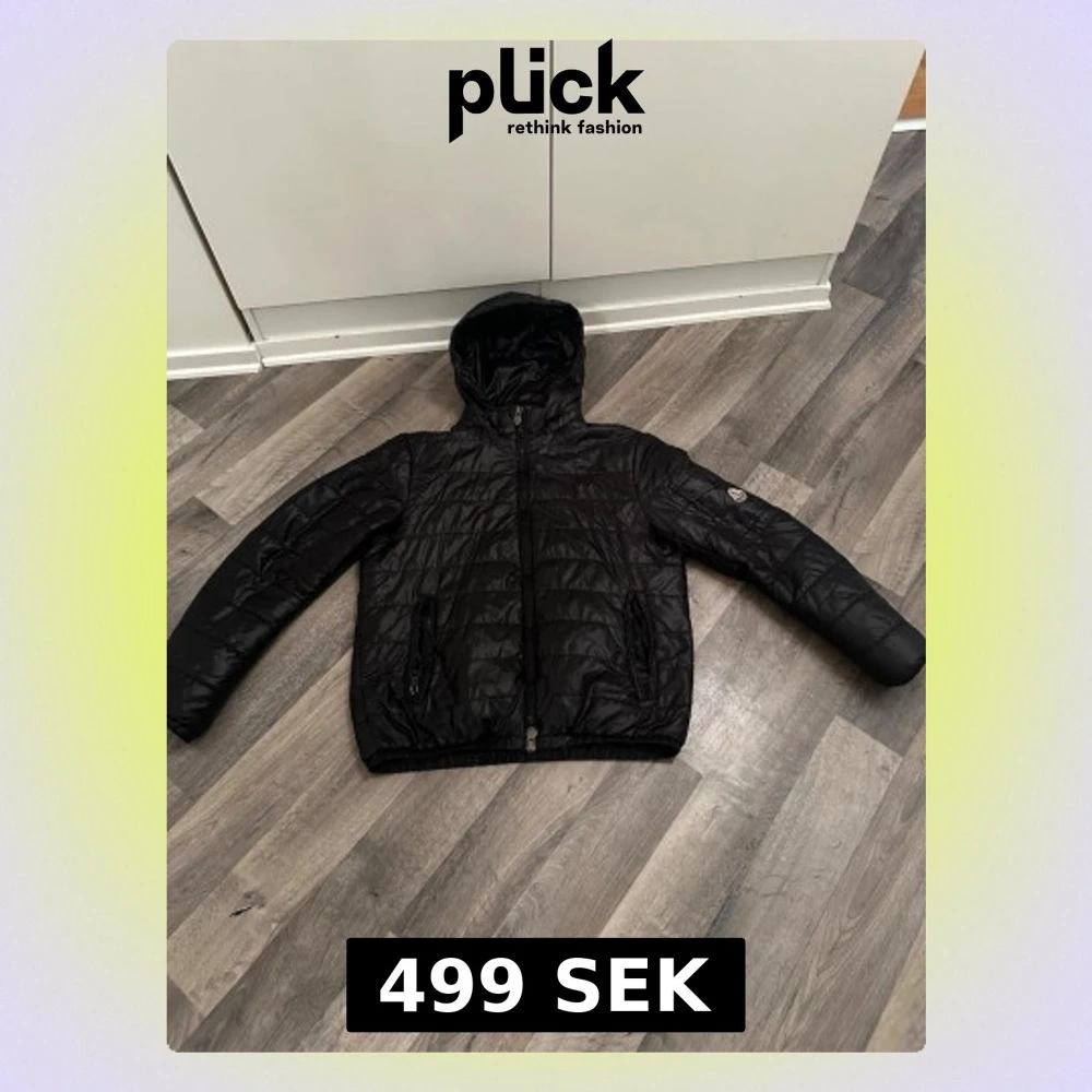 Snygg svart moncler jacka med huva och dragkedja framtill. Jackan har två fickor med dragkedja och quiltad design. Perfekt för kalla dagar och har en stilren look. Märke syns på ärmen men är otydligt. Materialet är glansigt och lätt vadderat.