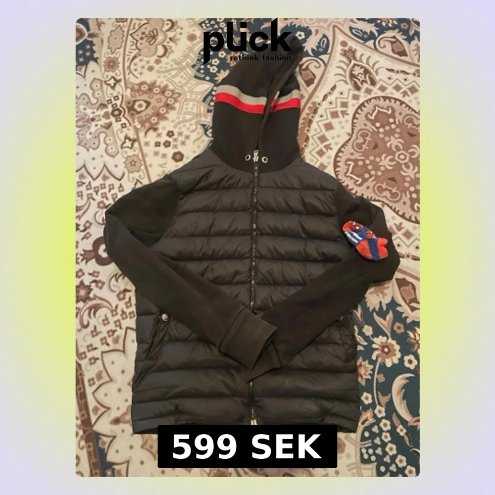 Snygg svart pufferjacka med quiltad kropp och mjuka ärmar. Jackan har en huva med röda och grå ränder samt dragkedja framtill. Två sidofickor med knappstängning. Perfekt för kalla vinterdagar och riktigt chill stil, den är lite solbränd och dragkedjan går ner av sig själv när man går.