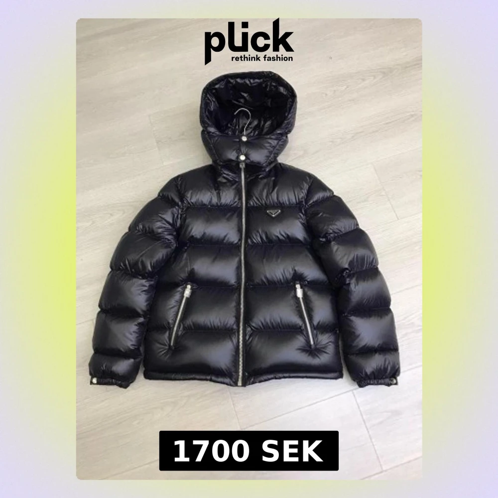 Säljer en svart, glansig pufferjacka från Prada med huva och dragkedja framtill. Jackan har två snedställda fickor med dragkedja och diskret logga på bröstet. Perfekt för kalla vinterdagar och riktigt trendig look.