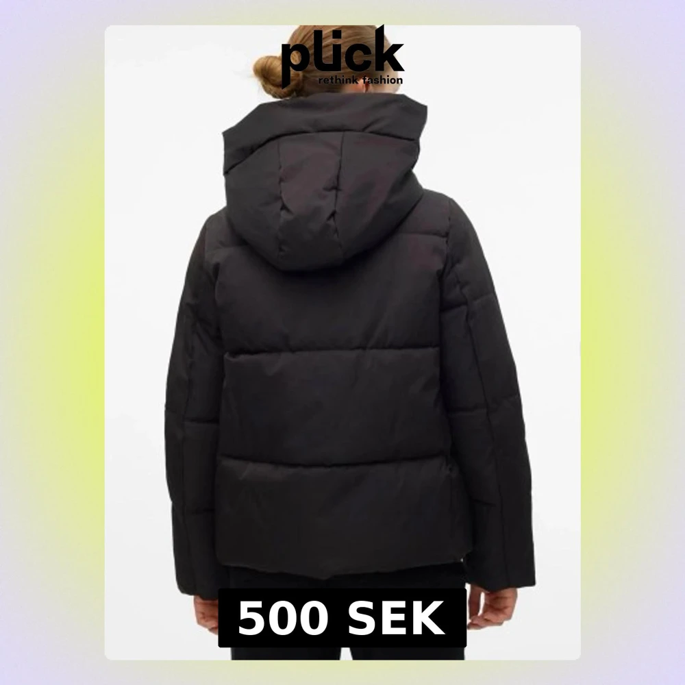 Säljer en svart pufferjacka med stor, mysig huva och breda quiltade paneler. Jackan har rak passform och dold dragkedja framtill. Perfekt för kalla vinterdagar och ger en stilren look.