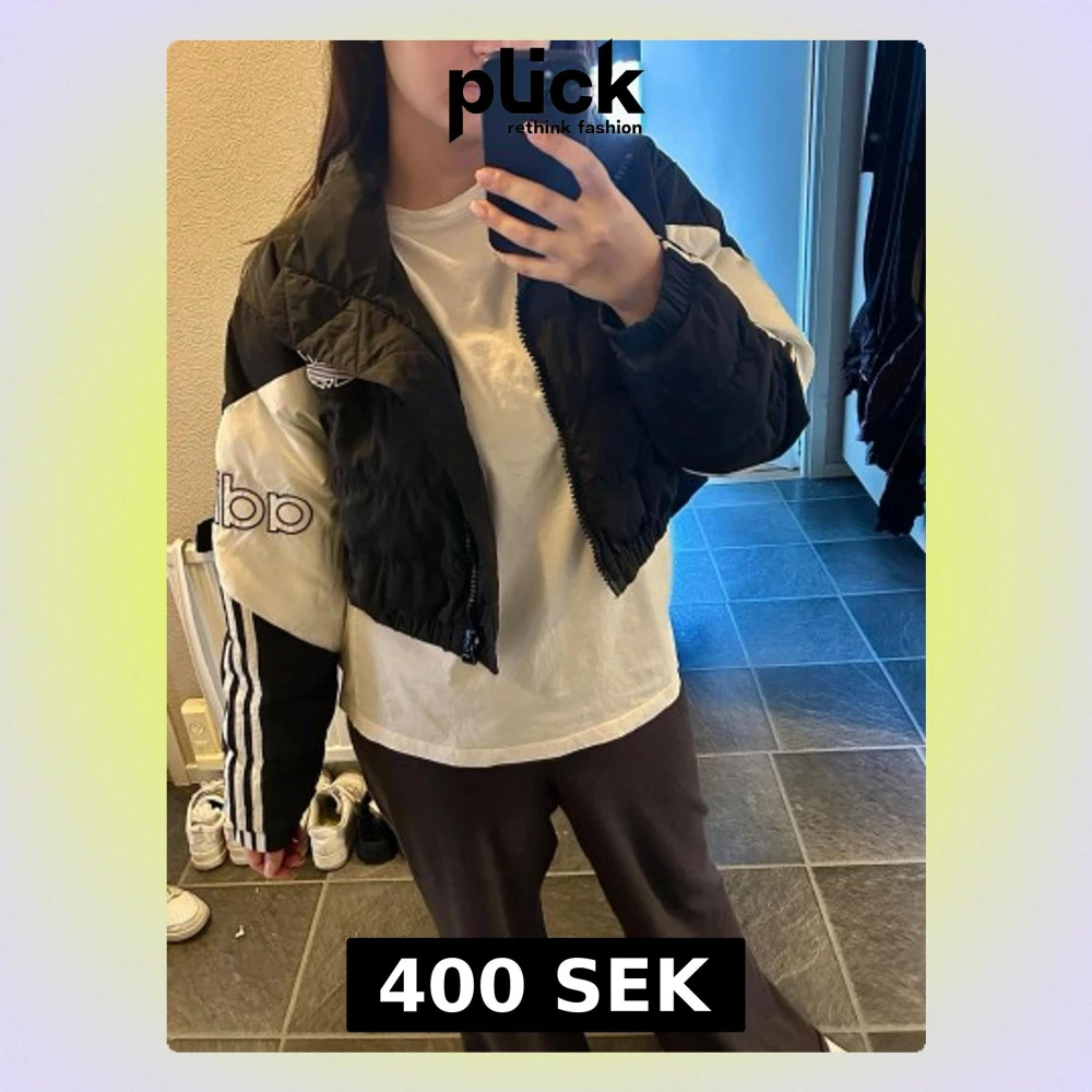 Säljer en svartvit cropped pufferjacka från Adidas med broderad logga på bröstet och ärmen. Jackan har dragkedja framtill, hög krage och sportiga detaljer som de klassiska ränderna på ärmen. Perfekt för dig som gillar streetwear och vill sticka ut.