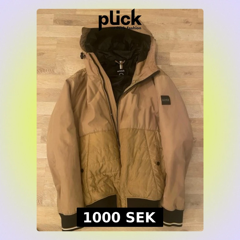 Snygg beige pufferjacka från BOSS med svart innerfoder och huva. Ny andvänd ett par gånger har en liten fläck under luvan vatten går att ta bort annars så är det top kvalitet. PRIS KAN DISKUTERAS.