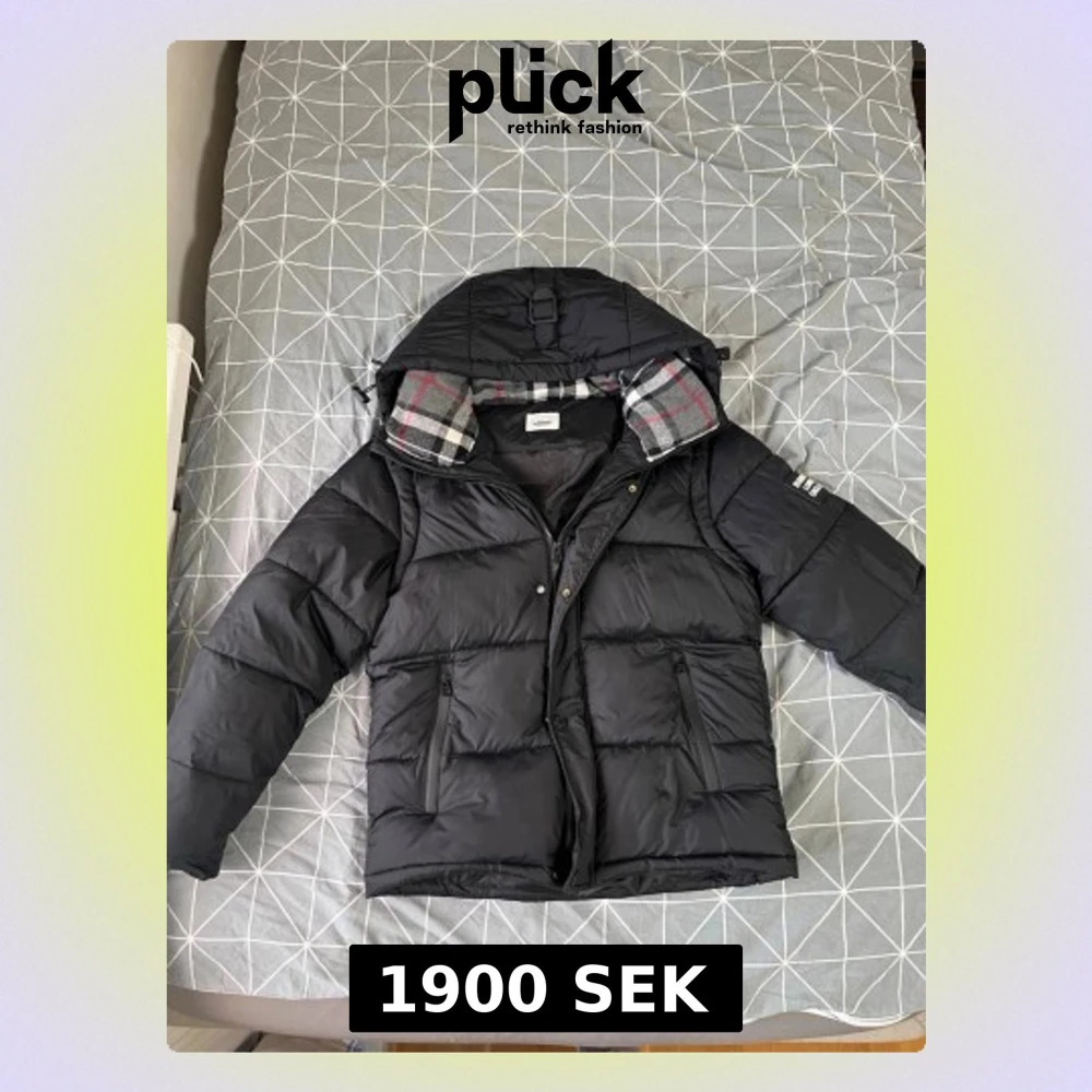 Säljer en svart pufferjacka från burberry med stor huva och rutigt foder i grått, vitt och rött. Jackan har två snedställda fickor med dragkedja, tryckknappar och dragkedja framtill. Perfekt för kalla vinterdagar och riktigt skön att bära.