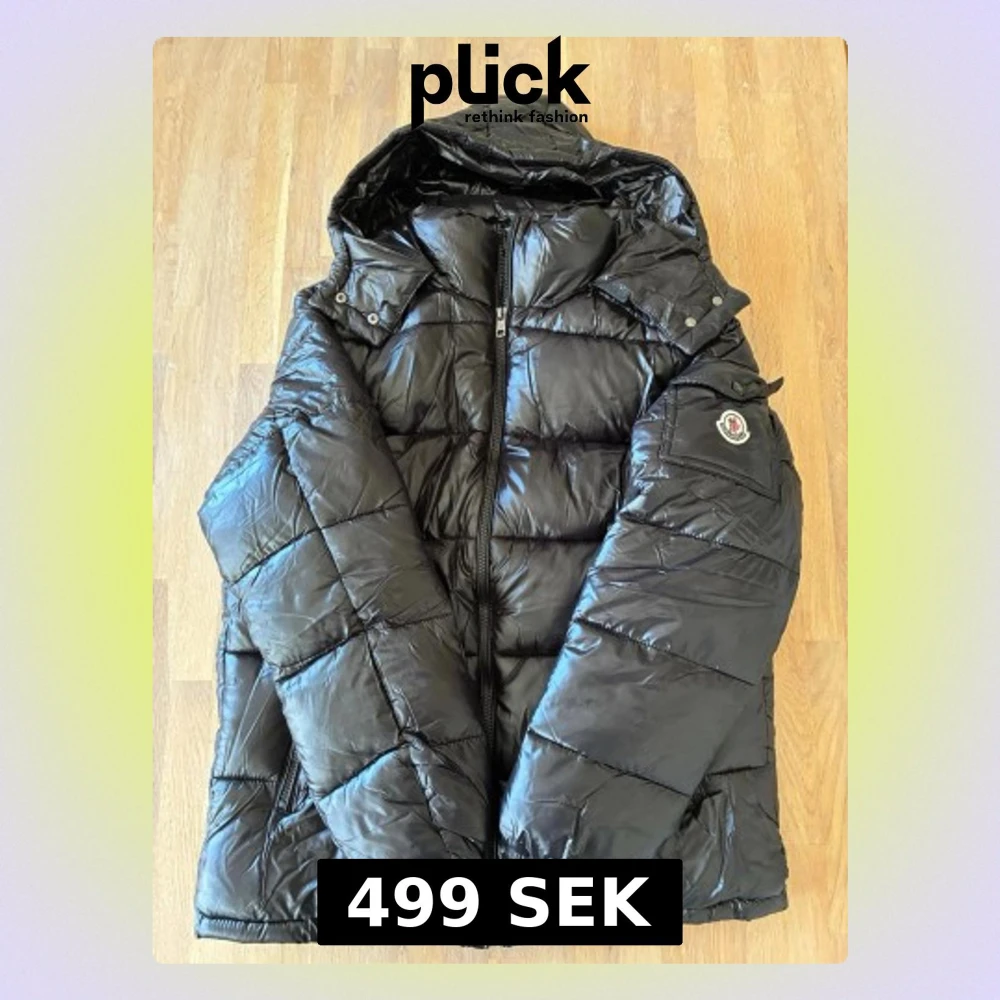 Snygg svart pufferjacka från Moncler med glansig finish, huva och dragkedja framtill. Jackan har två framfickor med dragkedja och Moncler-logga på ärmen. Perfekt för kalla vinterdagar och riktigt trendig look.