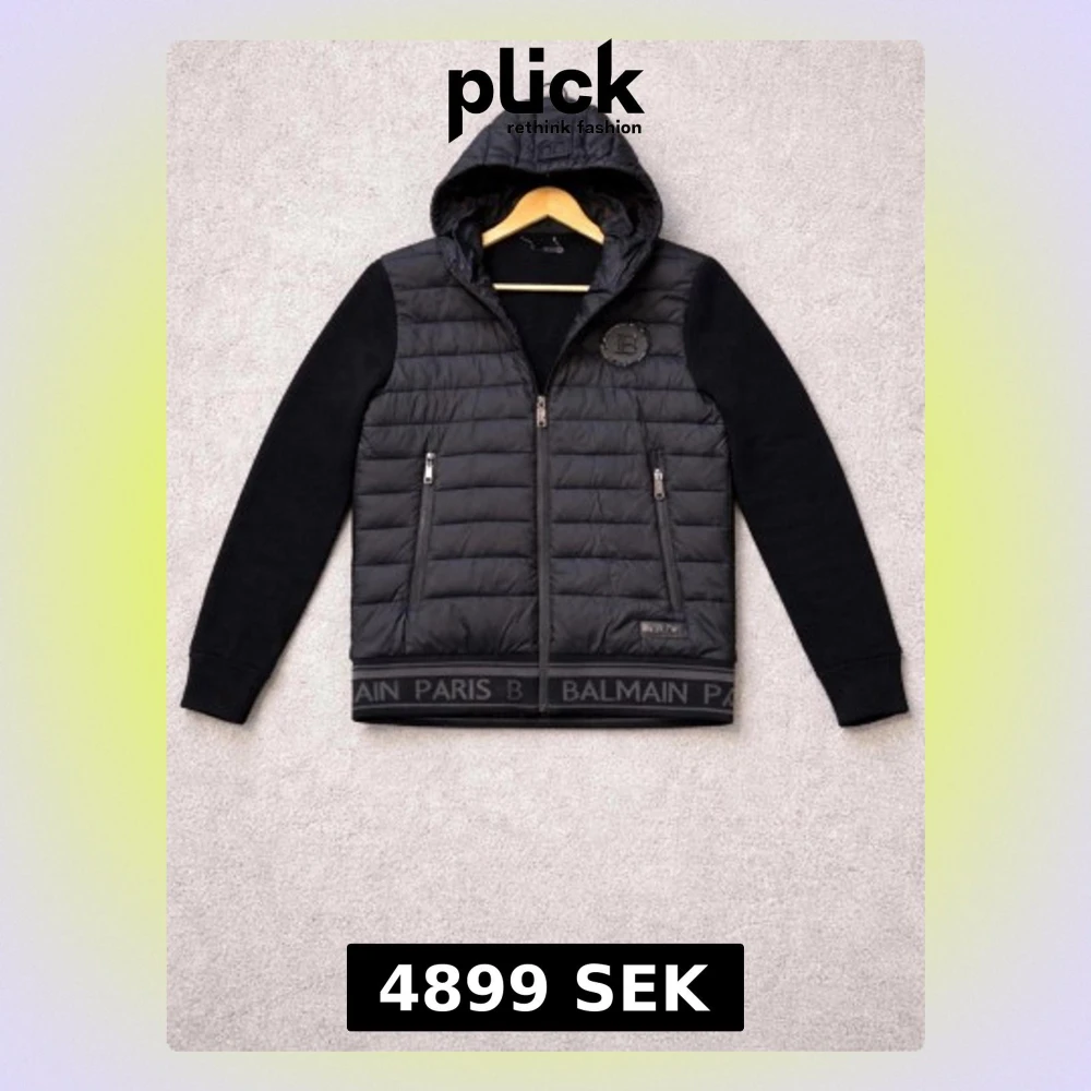Snygg svart pufferjacka från Balmain med huva och dragkedja framtill. Jackan har quiltad kropp, stickade ärmar och ribbade muddar. Två framfickor med dragkedja och Balmain Paris-logga längs nederkanten. Perfekt för kalla dagar och riktigt trendig look.
