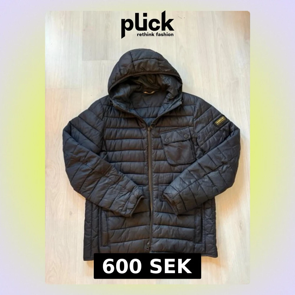 Svart quiltad pufferjacka från Barbour International med huva och dragkedja framtill. Jackan har en bröstficka med knapp och en patch med Barbour-logga på ärmen. Perfekt för kyliga dagar och riktigt snygg streetstil.