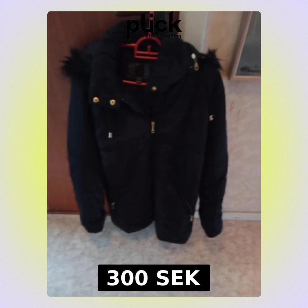 Snygg svart pufferjacka med huva och fuskpälsdetaljer. Jackan har dragkedjor i guld, flera fickor och hög krage. Perfekt för kalla vinterdagar och ger en cool streetstil. Materialet är vadderat och håller värmen bra.