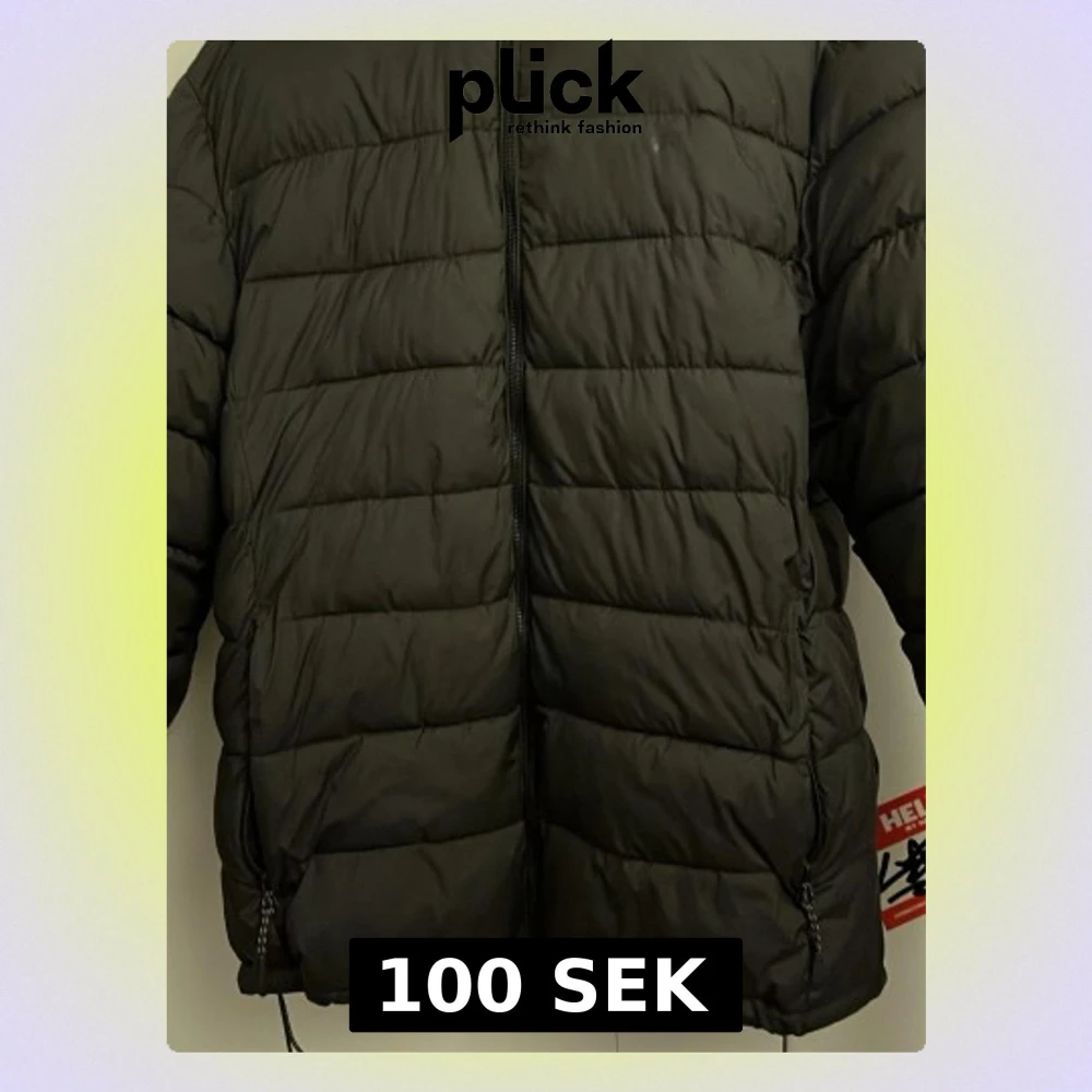 Säljer en svart pufferjacka med huva och dragkedja framtill. Jackan har två fickor med dragkedja och breda, horisontella kanaler som ger en klassisk pufferlook. Perfekt för kalla vinterdagar och riktigt skön att bära.