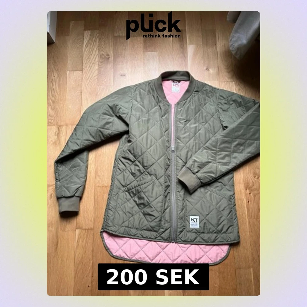 Snygg olivgrön pufferjacka från Kari Traa med quiltat mönster och rosa innerfoder. Jackan har dragkedja framtill, ribbade muddar vid ärmslut och längre bakstycke. Perfekt för våren / sommaren och riktigt skön att bära.
