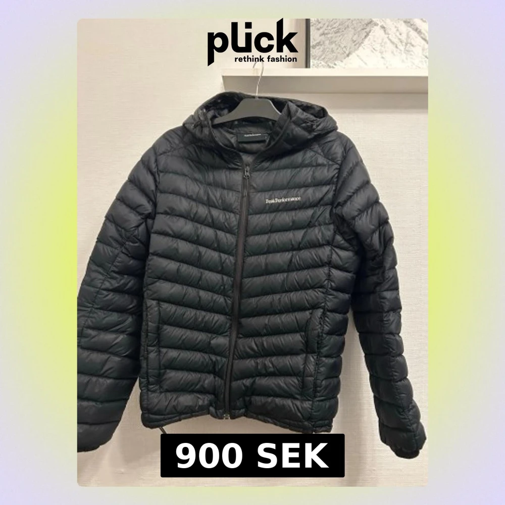 Säljer en svart pufferjacka från Peak Performance med huva och dragkedja framtill. Jackan har diskret logga på bröstet och är lätt vadderad med horisontella sömmar. Perfekt för kalla dagar och enkel att matcha med olika outfits.