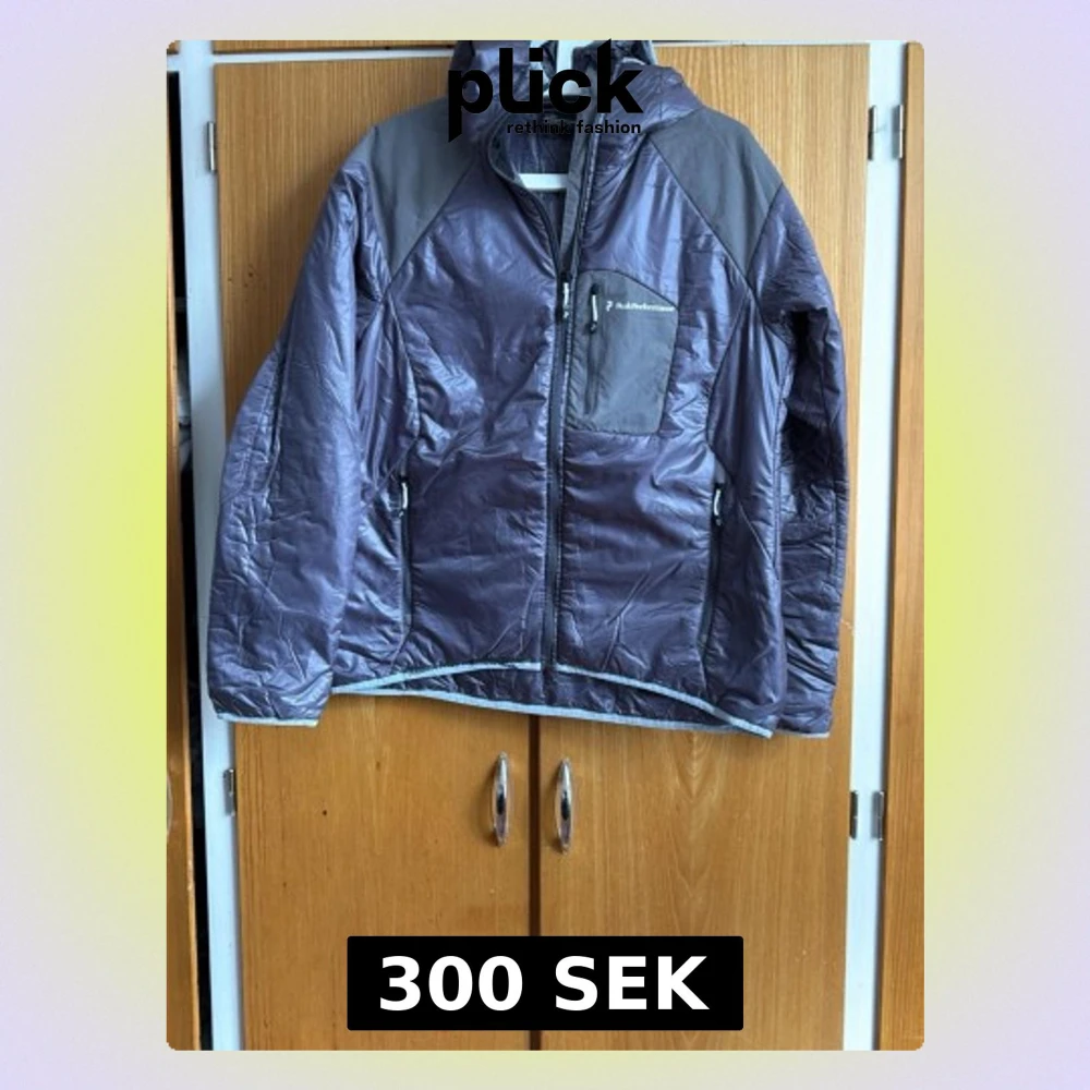 Snygg grå pufferjacka från Peak Performance med huva och dragkedja framtill. Jackan har en bröstficka med dragkedja och logga, samt två sidofickor. Materialet är glansigt och lätt vadderat, perfekt för kalla vinterdagar.