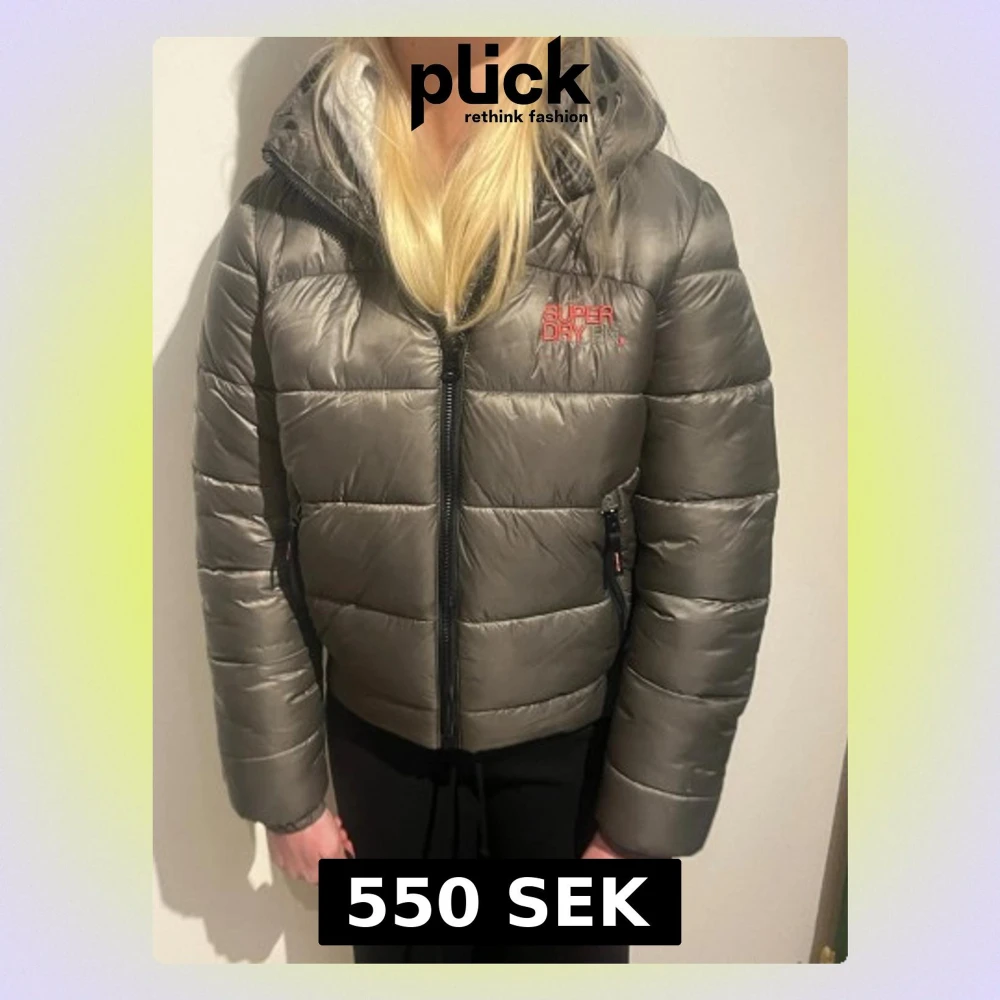 Snygg grå pufferjacka från Superdry med huva och dragkedja framtill. Jackan har två fickor med dragkedja och logga i rött på bröstet. Perfekt för kalla dagar och ger en cool, sportig look. Jackan är 38 men mer som en S