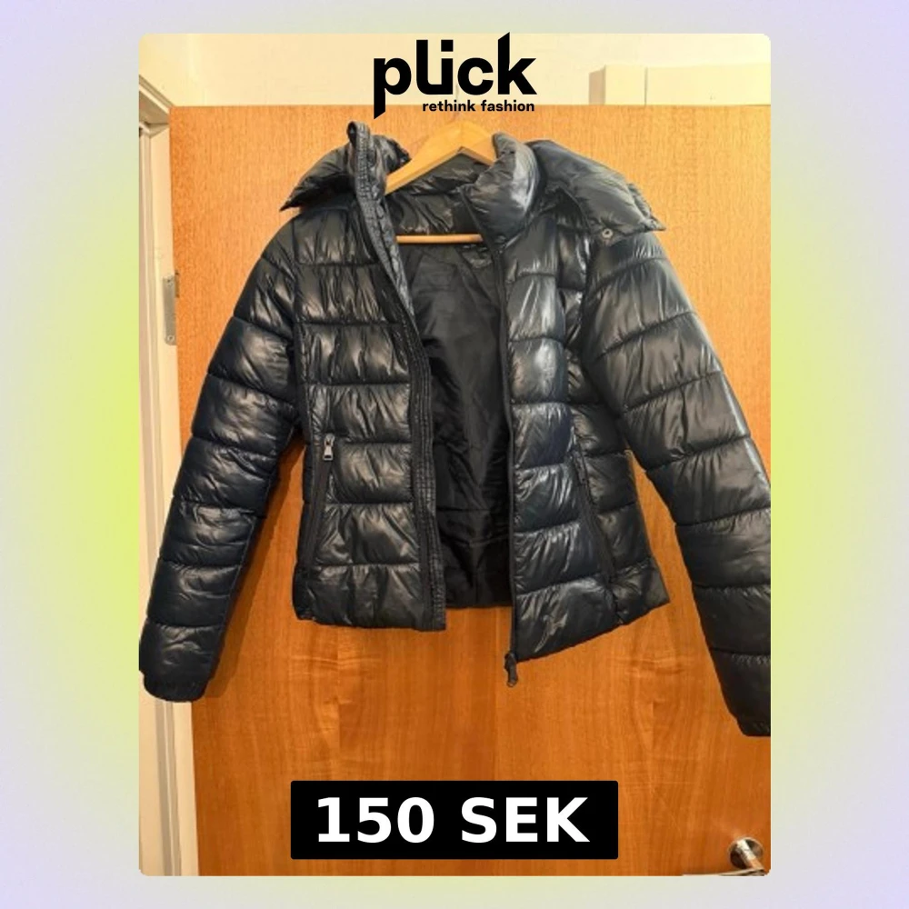 Snygg svart pufferjacka med huva och dragkedja framtill. Jackan har quiltad design och två sidofickor med dragkedja. Perfekt för kalla dagar och ger en modern look. Materialet är glansigt och ger jackan en cool vibe.