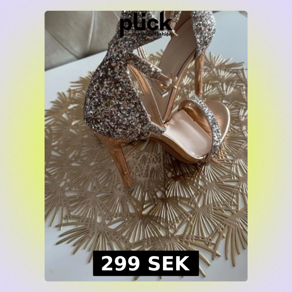 Säljer ett par glittriga pumps i guld med öppen tå och smal rem över foten. Skorna har höga klackar i metallic och justerbar ankelrem. Perfekta för dig som vill sticka ut med extra bling! Materialet är syntet med glitterdetaljer.