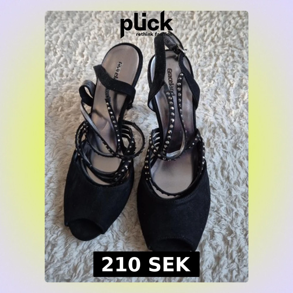 Säljer ett par svarta pumps från Graceland med öppen tå och flera tunna remmar dekorerade med strass. Skorna har en elegant design med klack och mjuk sammetsliknande yta. Perfekta för dig som vill ha något extra till outfiten.