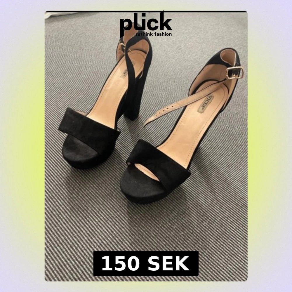 Säljer ett par svarta pumps från Vices med bred klack och platåsula. Skorna har öppen tå, justerbar rem med guldfärgat spänne och är klädda i mockaimitation. Perfekta för dig som gillar chunky klackar och stilren design.