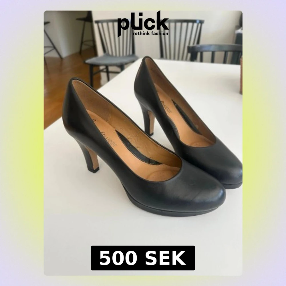 Stilrena svarta pumps med rund tå och hög klack. Skorna har en diskret platåsula framtill och är tillverkade i slätt skinn med beige innersula. Perfekta för dig som gillar en tidlös och elegant look.