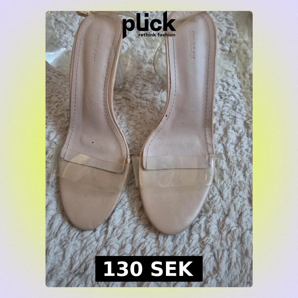 Säljer ett par snygga pumps från Shein i beige med transparent rem över tårna. Skorna har en öppen tå och klack, samt en stilren design med plastdetaljer som ger en modern look.