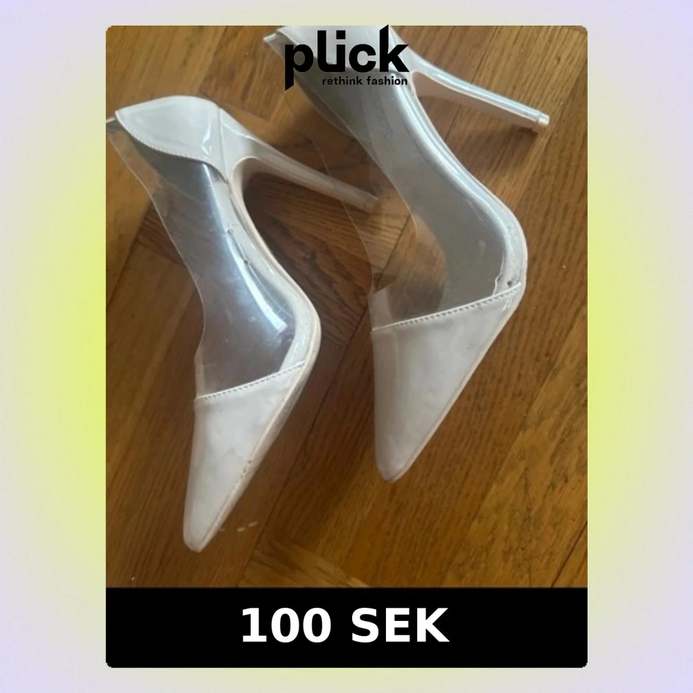 Säljer ett par vita pumps från Nly shoes med spetsig tå och transparenta sidor i plast. Klackarna är smala och eleganta, vilket ger en modern och trendig look. Perfekta för dig som vill sticka ut med en unik design.