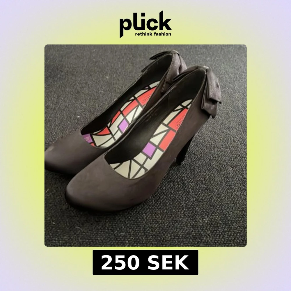 Säljer ett par svarta pumps med hög klack och rund tå. Skorna har en stor dekorativ rosett baktill och insidan har ett färgglatt grafiskt mönster. Perfekta för dig som vill ha något extra till outfiten.