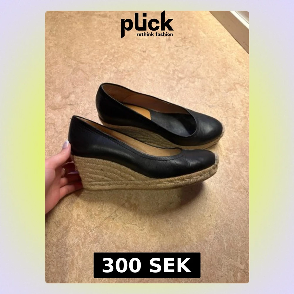Snygga svarta pumps med rund tå och kilklack i flätad jute. Ovandelen är i svart läderimitation och klacken ger extra höjd utan att tumma på komforten. Perfekta för dig som vill ha en stilren sko med lite boho-vibe. Mycket fina inför sommaren och mycket annat. Hör av dig vid intresse⭐️
