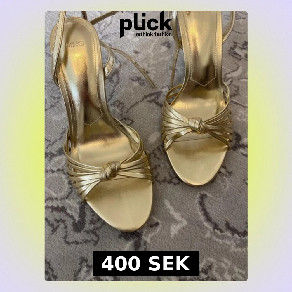 Säljer ett par snygga guldiga pumps från Mango med smala remmar och dekorativ knut framtill. Skorna har öppen tå, smal klack och justerbar ankelrem. Perfekta för dig som vill sticka ut med metallic och elegant design. Använd en gång till balen!