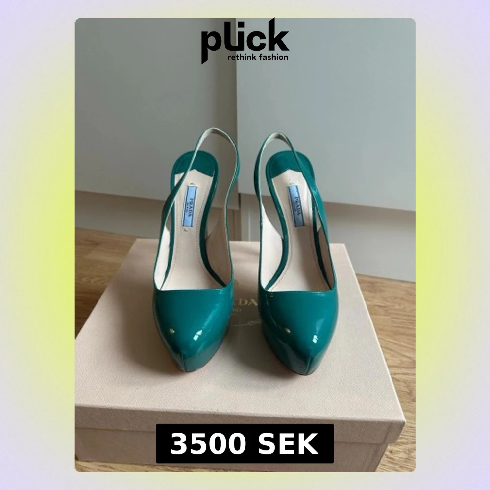 Snygga petrol pumps från Prada i glansigt lackläder. Skorna har öppen häl med smal rem och spetsig tå, vilket ger en elegant och trendig look. Perfekta för dig som vill sticka ut med färg och exklusiv design.