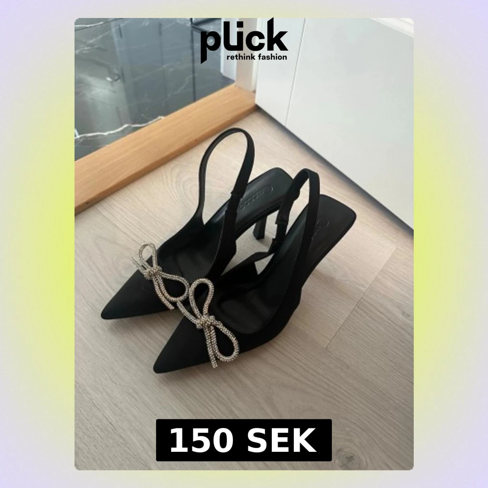 Stilrena svarta pumps med spetsig tå och öppen häl. Skorna har en elegant strassrosett framtill och smal klack. Tillverkade i ett matt tygmaterial med slingback-rem. Perfekta för dig som vill sticka ut med en trendig och chic look.