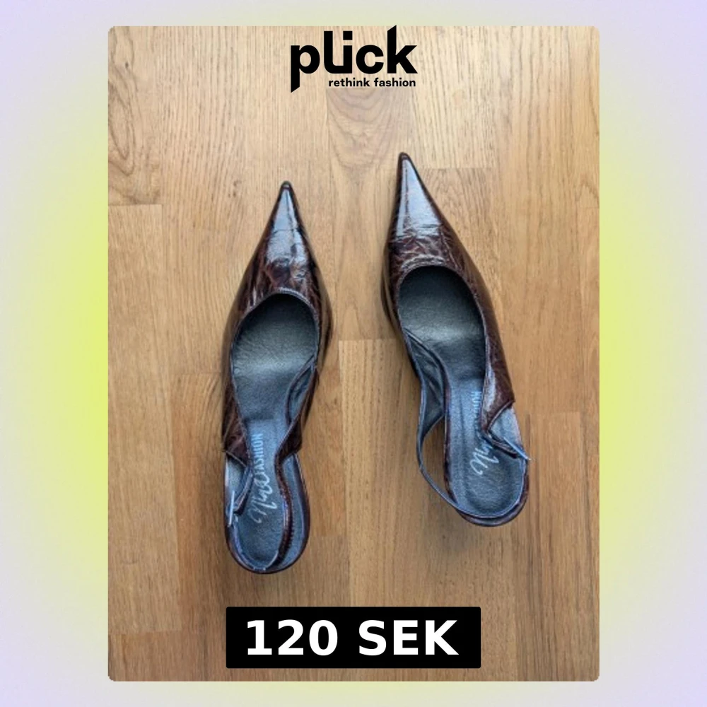Säljer ett par bruna pumps från Marco Tozzi med spetsig tå och smal klack. Skorna har en glansig lackyta och öppen häl med rem runt ankeln. Perfekta för dig som gillar en elegant och trendig look.