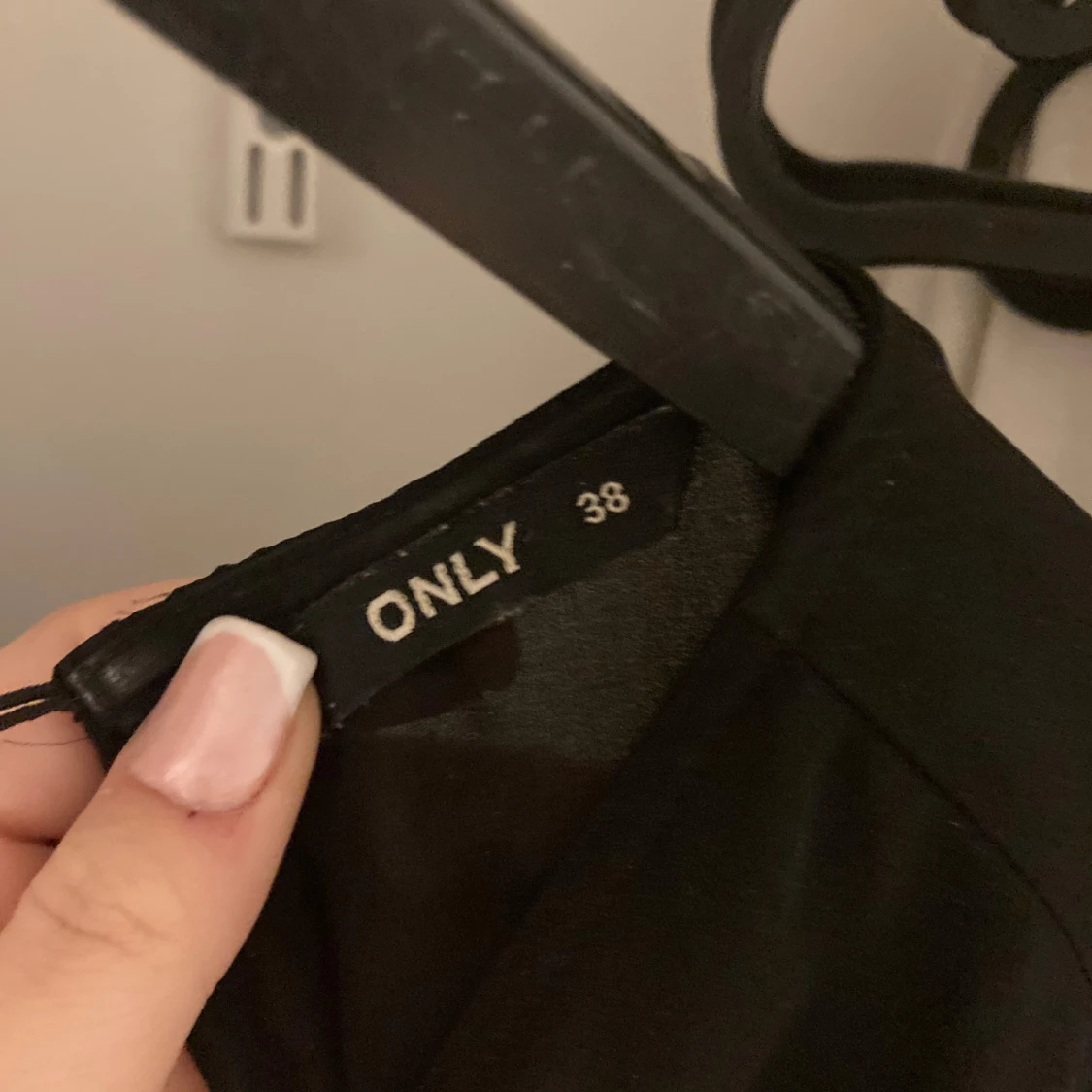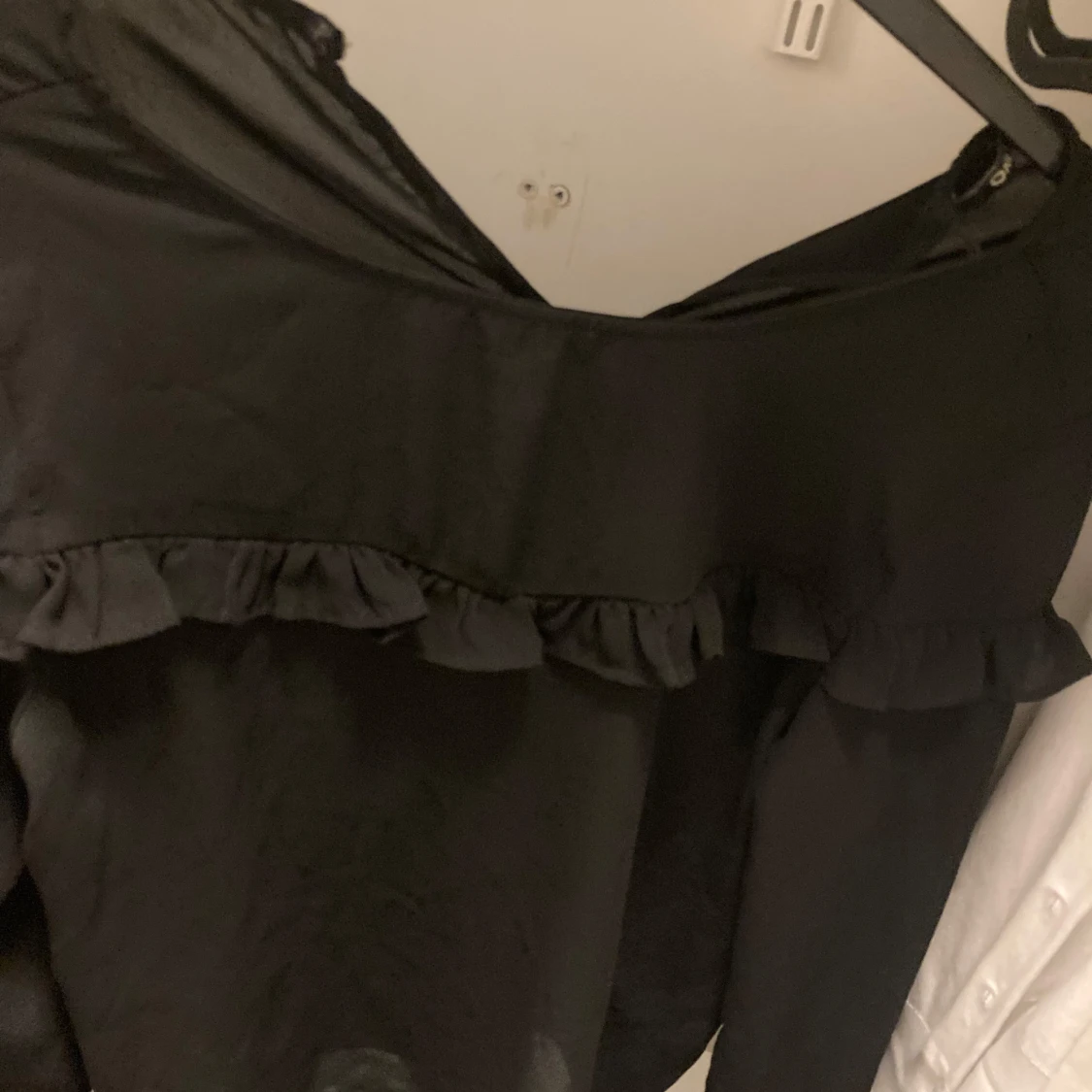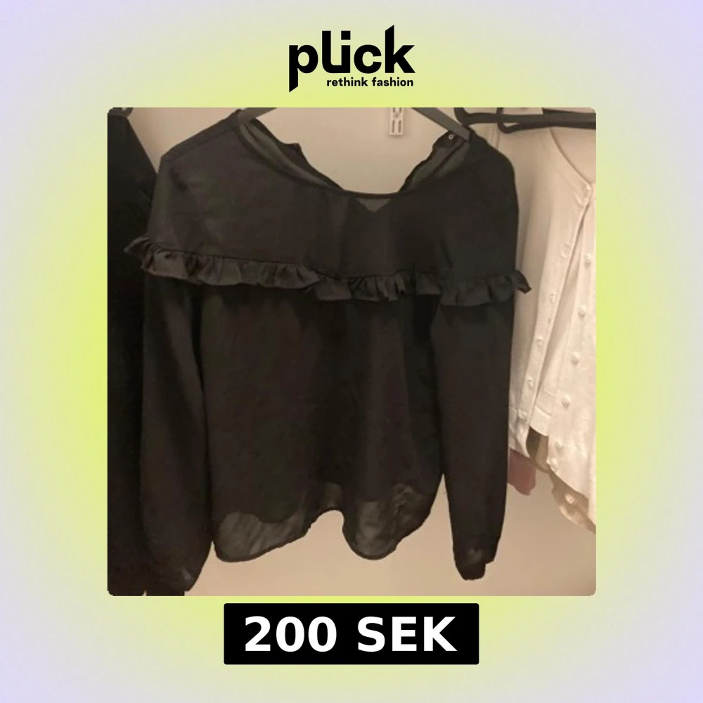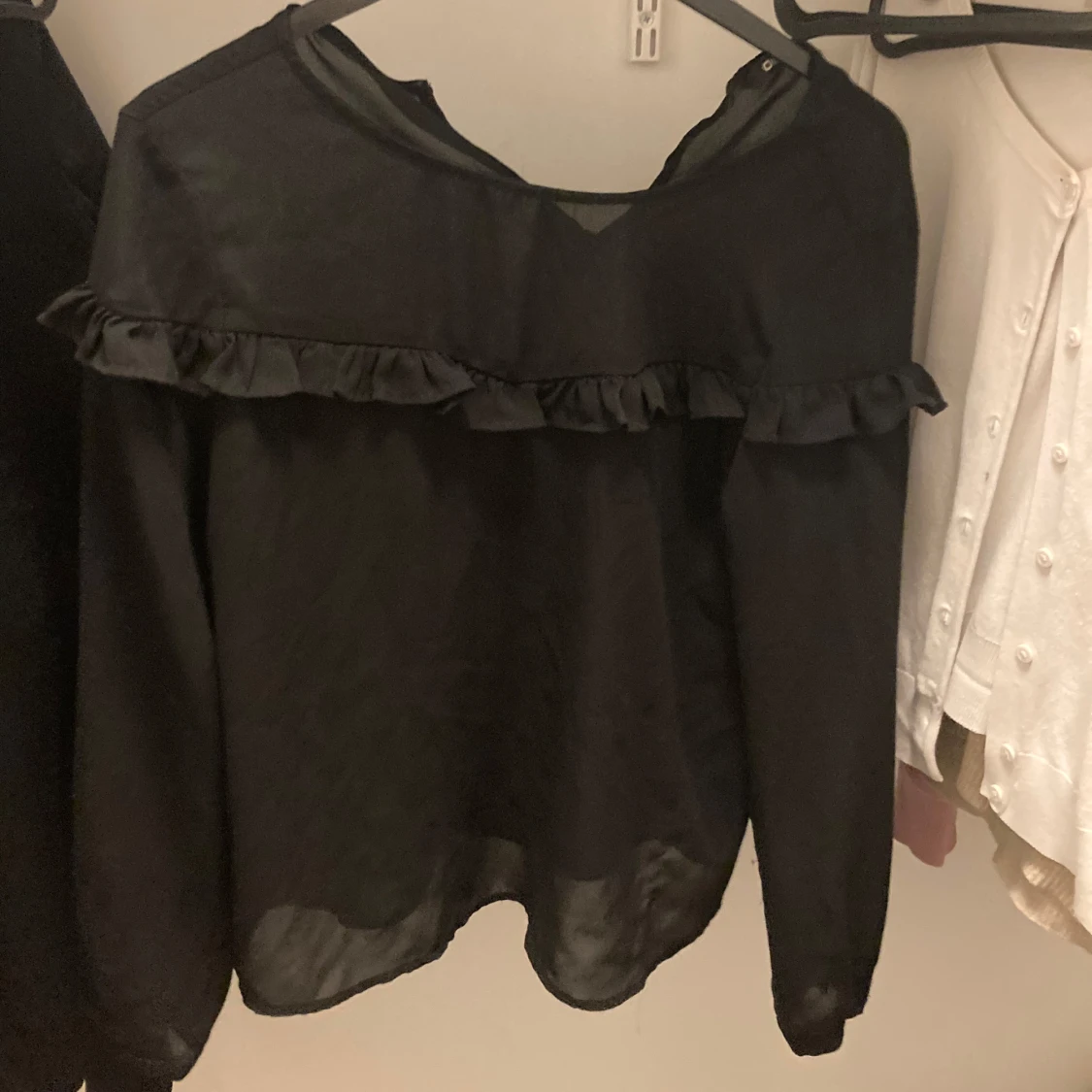 Säljer en svart blus från ONLY i storlek 38. Blusen har långa ärmar och en volangdetalj som går runt överdelen. Perfekt för dig som gillar en stilren look med en liten twist.