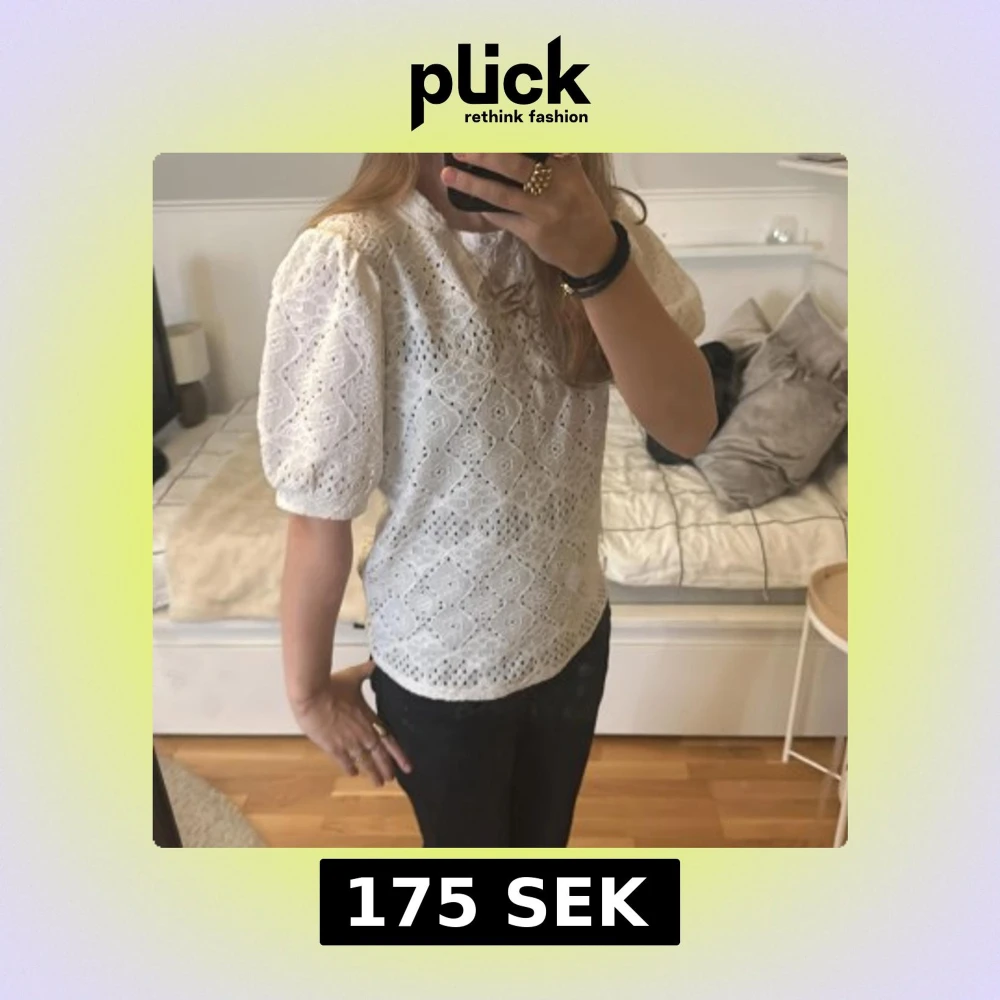 Säljer en söt vit spetsblus med puffiga kortärmar. Blusen har ett vackert broderat mönster och en rund halsringning. Perfekt för en somrig look!💓