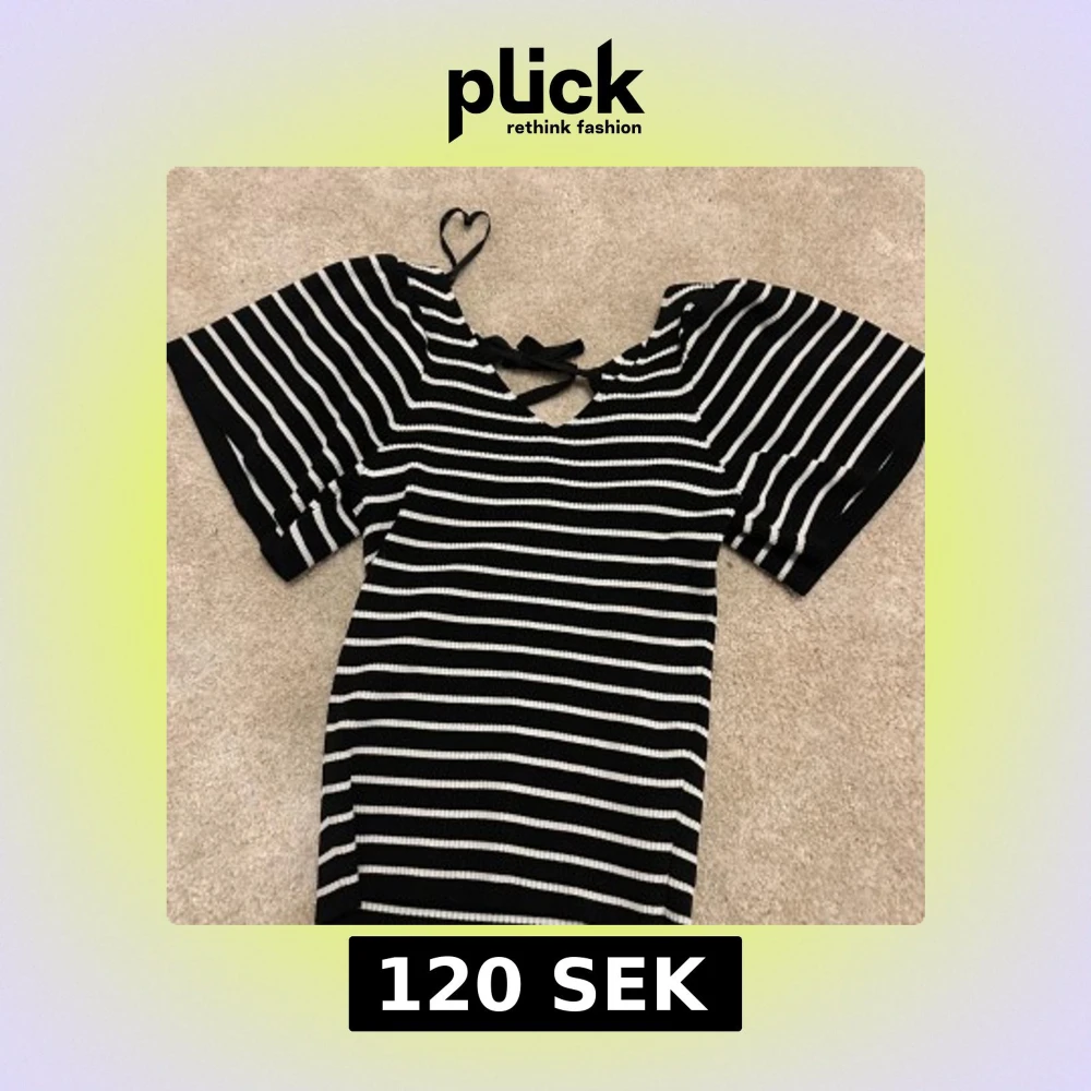 Blus med svartvita horisontella ränder, v-ringning och snygg knytning i ryggen. Blusen har korta ärmar och är ribbad i materialet vilket ger en cool struktur. Perfekt för dig som gillar en enkel men trendig look. Den är från Only ser inte storleken men skulle utgå från xs till s den är köpt för 400kr och mitt pris är 100. Skickar i morogon om man köper idag