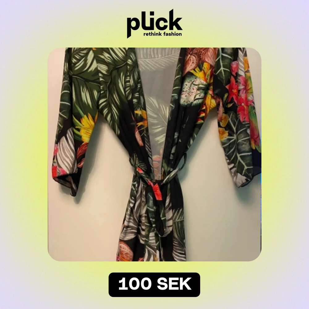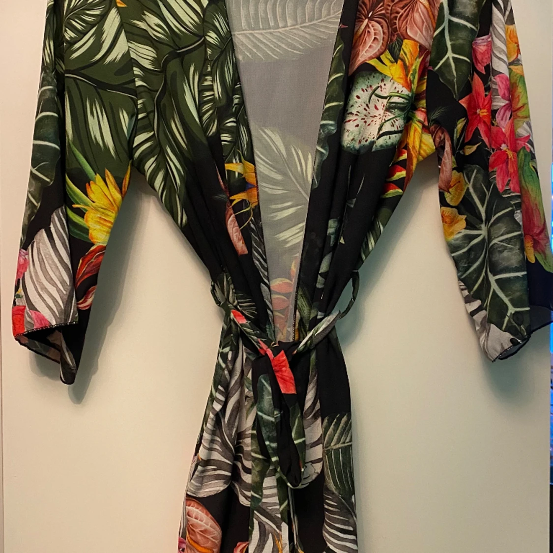 Badrock/ Kimono mycket kort, one size men passar mig som är 38-40, kan tänka mig att det är en S/M. Tyg i polyester.