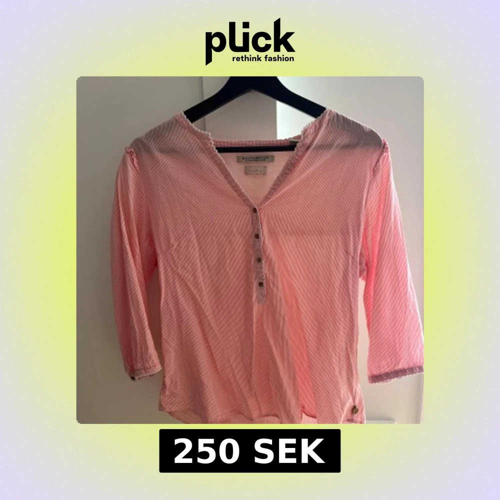 Säljer en söt rosa och vit randig blus från Maison Scotch med v-ringning och dekorativa knappar framtill. Blusen har trekvartsärm och fina spetsdetaljer vid halsringningen och ärmsluten. Perfekt för vår och sommar, superlätt och skön i bomull.
