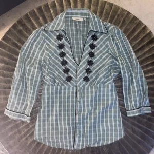 En randig ljusblå blus, men fina svarta detaljer som är insydda för hand. Är köpt utomlands och oandvänd. Pris går att diskuteras💕