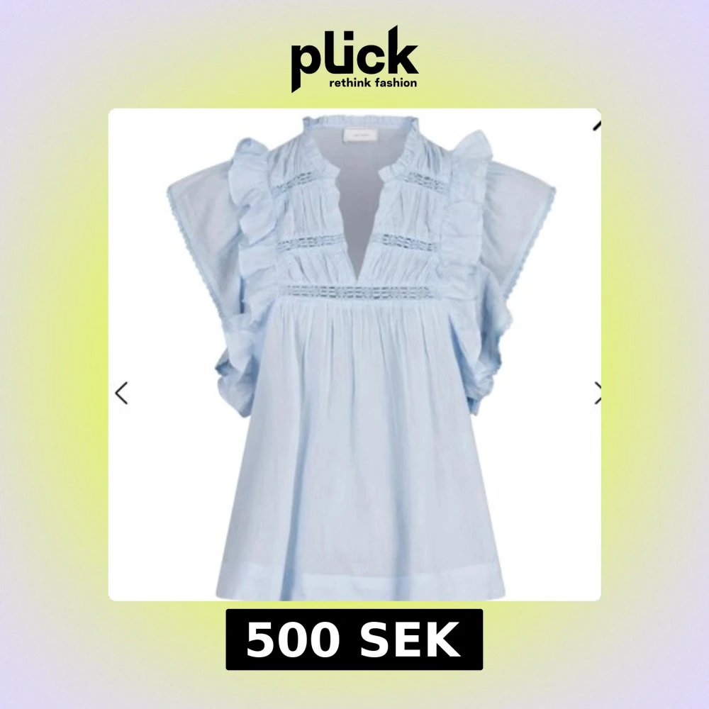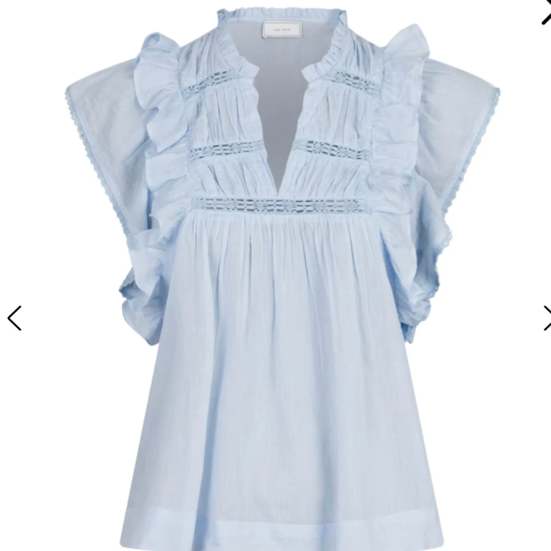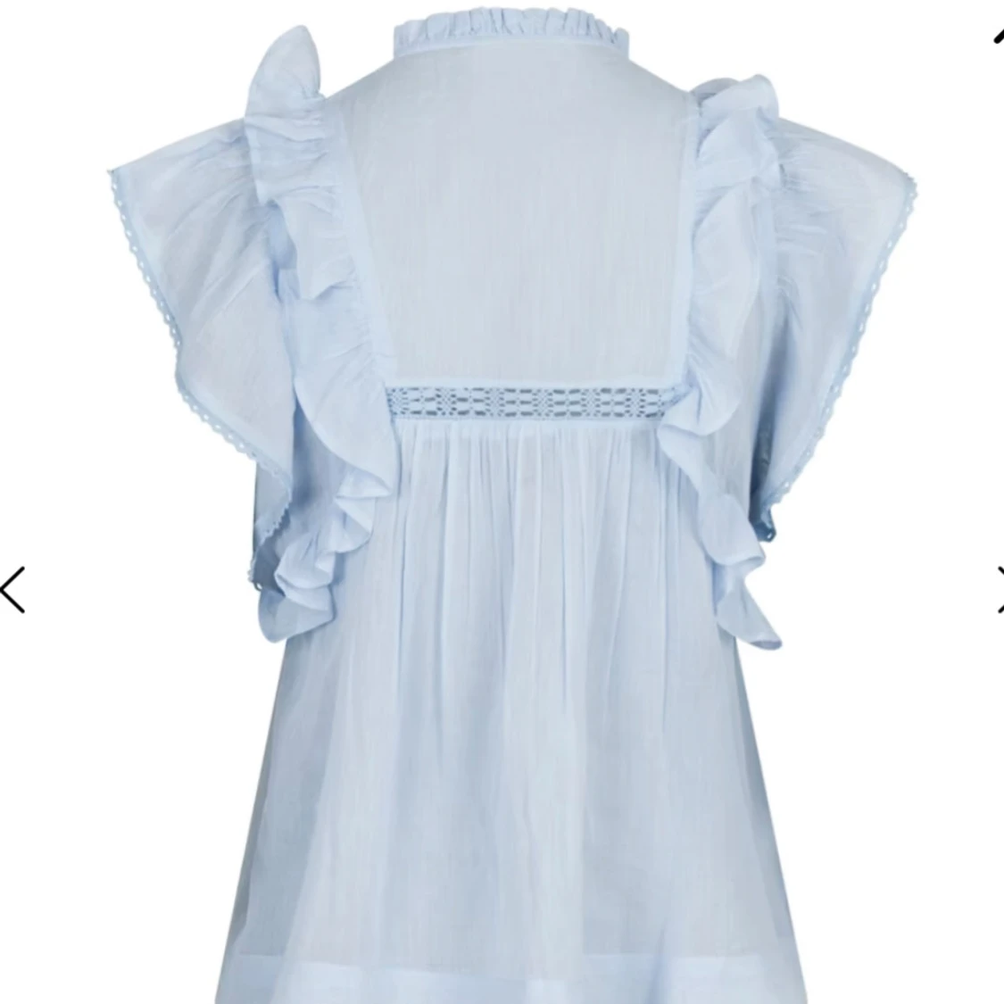 Supersöt ljusblå blus med volanger längs axlarna och v-ringning. Blusen har fina spetsdetaljer framtill och bak samt är ärmlös med en luftig passform. 🩵🩵