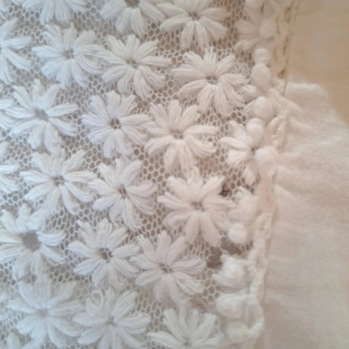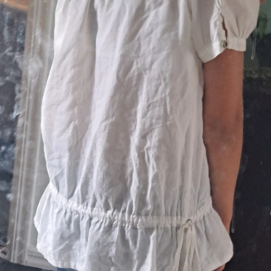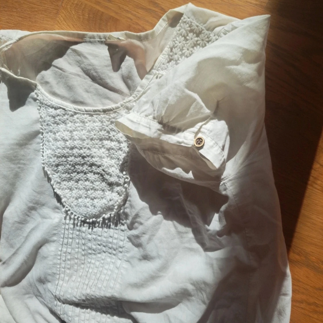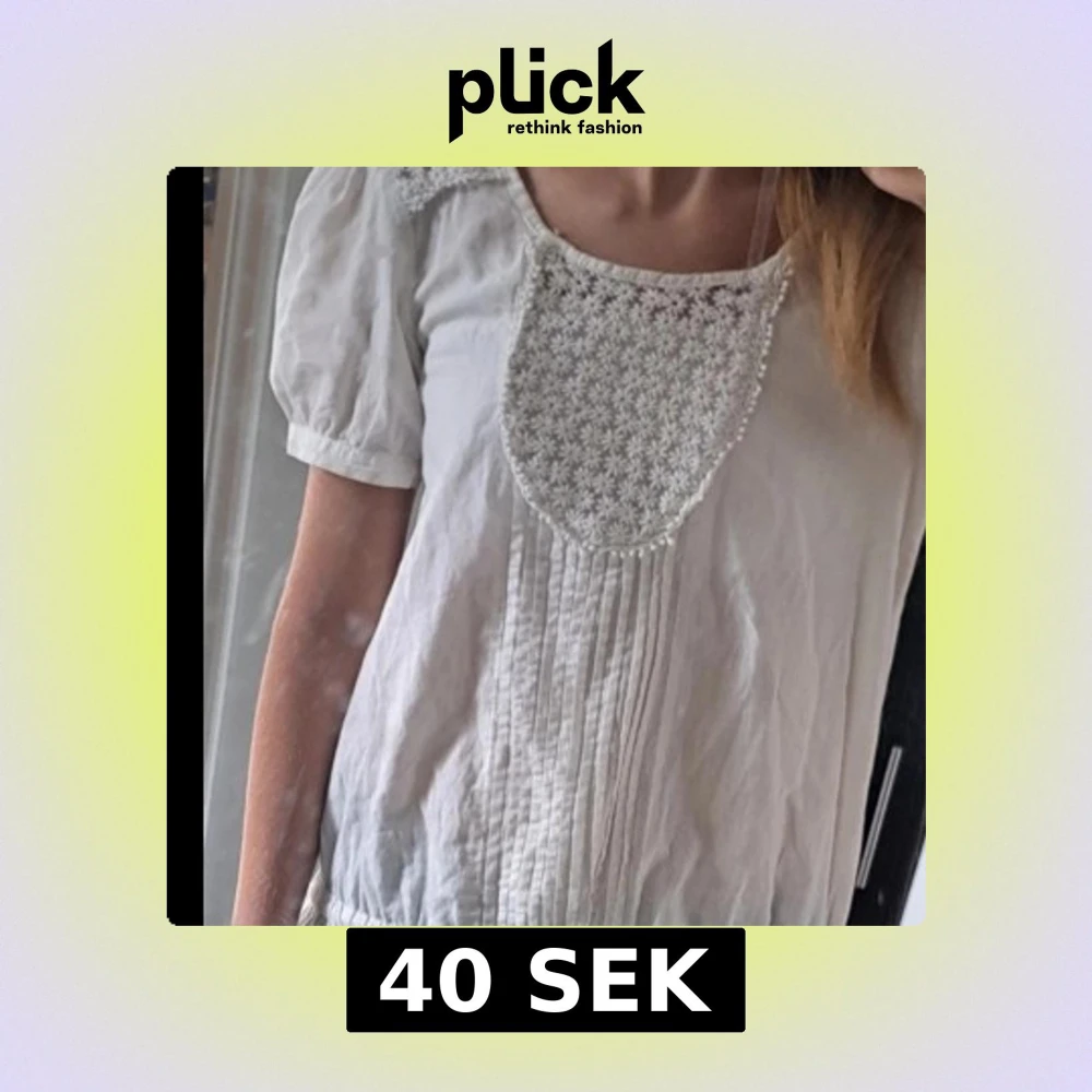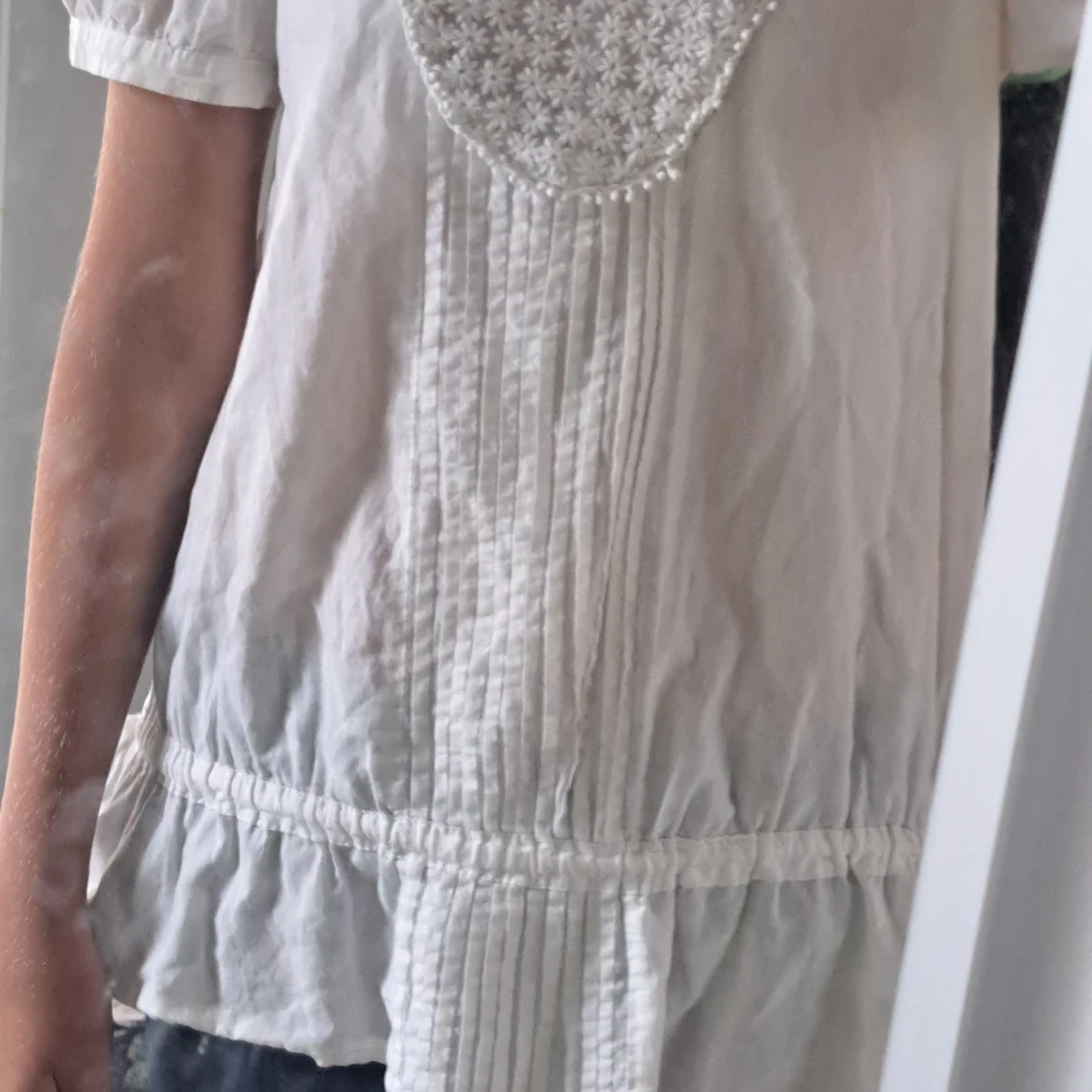 Supersöt vit blus med korta puffärmar. broderat blommönster vid halsen. Blusen har knytband i midjan och volang längst ner. Använd men absolut inga tecken på användning, bara lite svart på blommorna(bild finns). Står ingen storlek men skulle säga S, men man kan justera i midjan till tajtare.