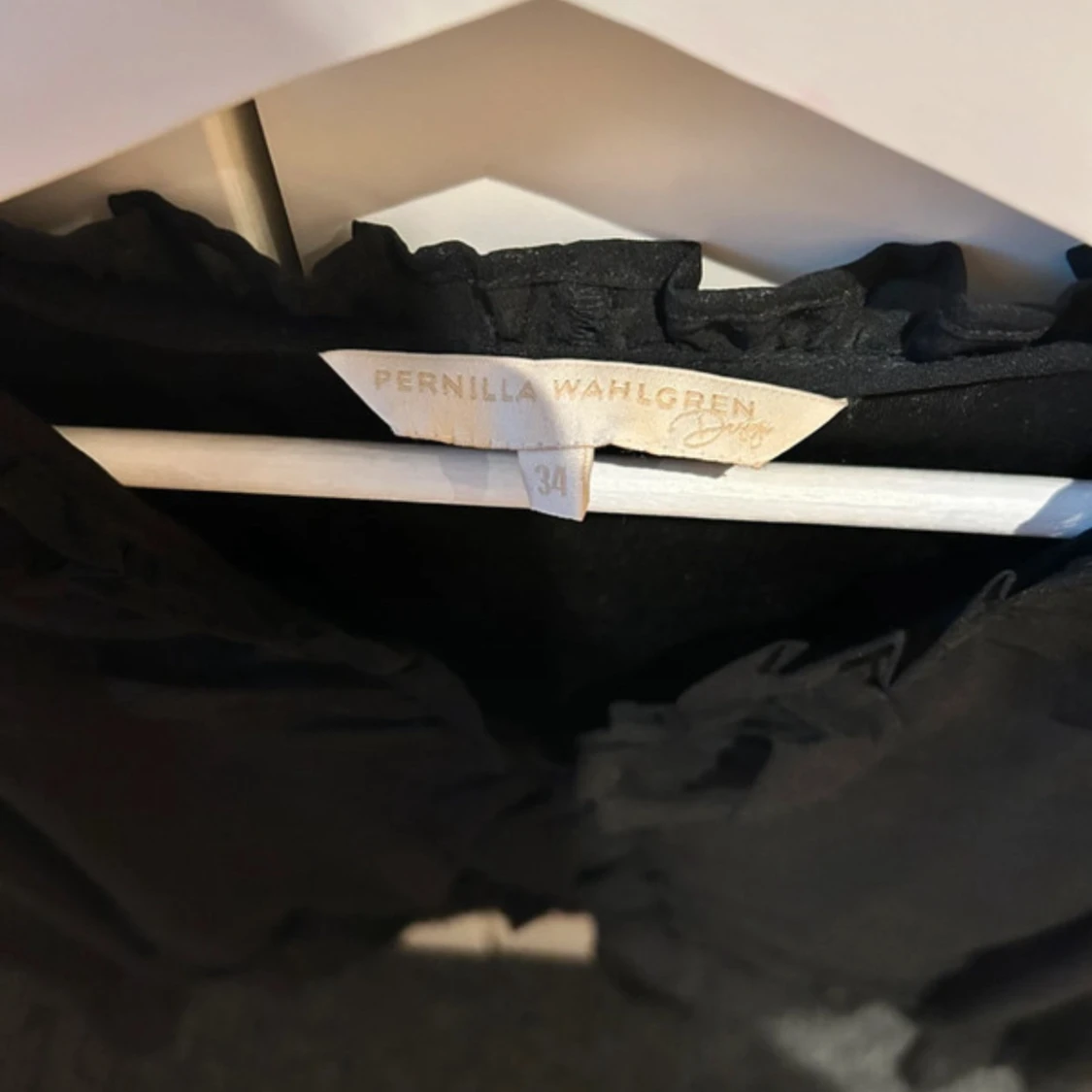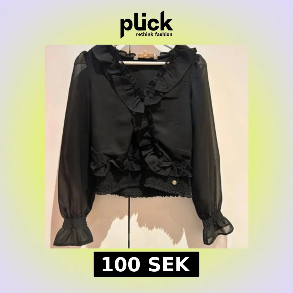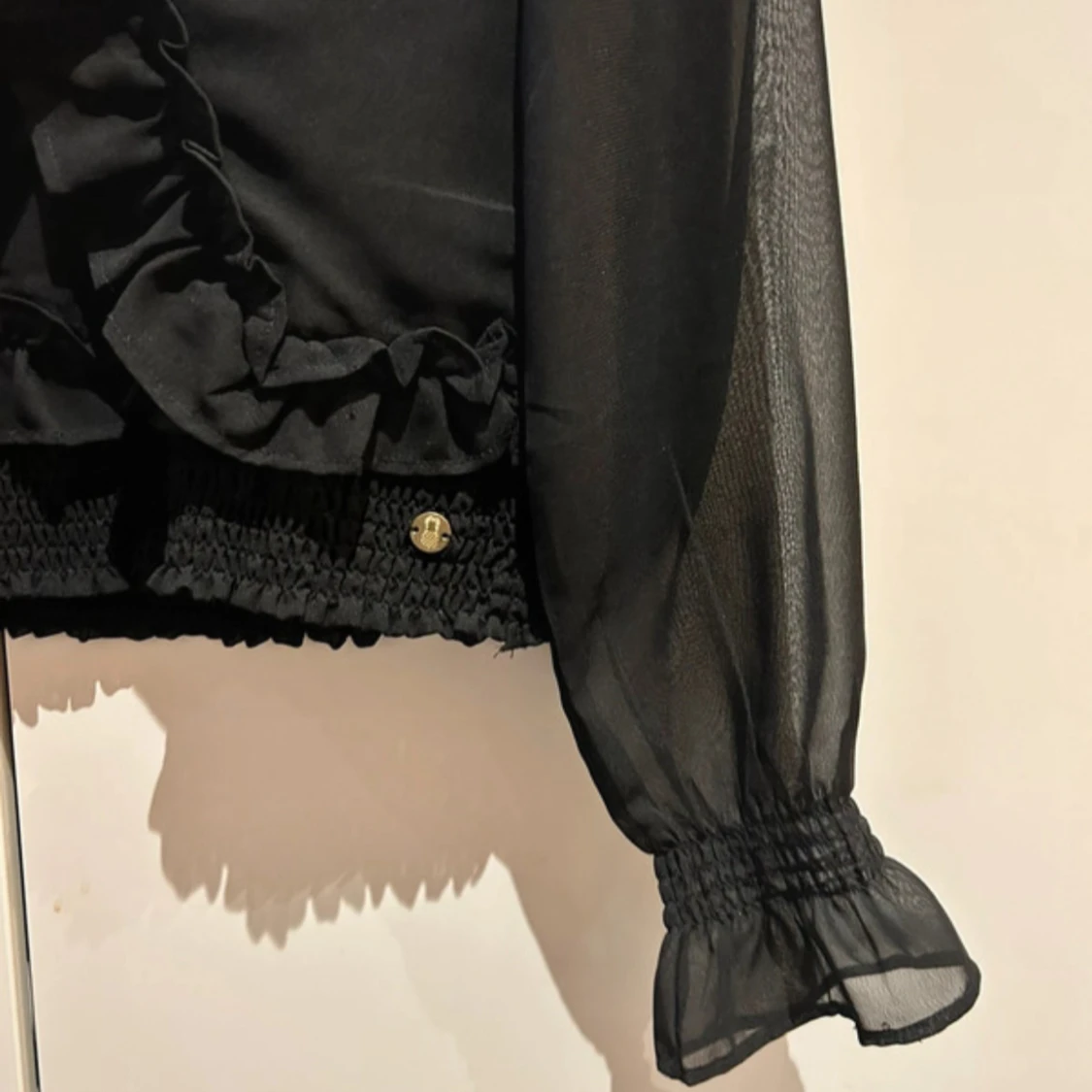 Supersnygg svart blus med transparenta långärmar och bred smock vid midjan och ärmslut. Volangdetaljer längs halsringningen och framtill. Liten guldfärgad knappdetalj vid midjan. Från Pernilla Wahlgrens kollektion. Använd ett fåtal gånger. Storlek 34