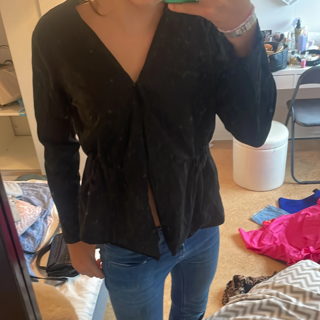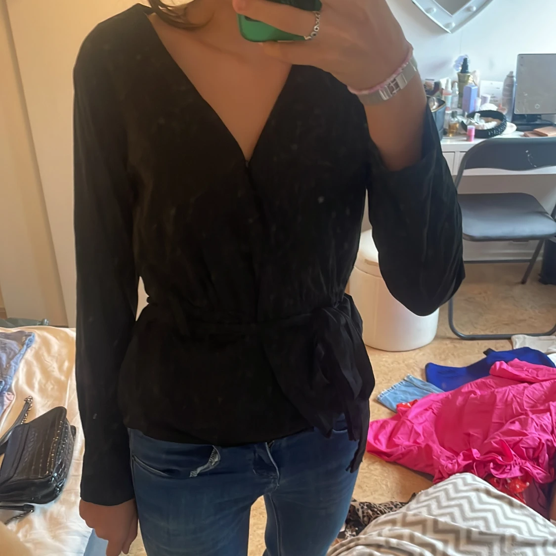 En jätte fin blus som man kan ha med ett litet skärp eller inte fint både och.
