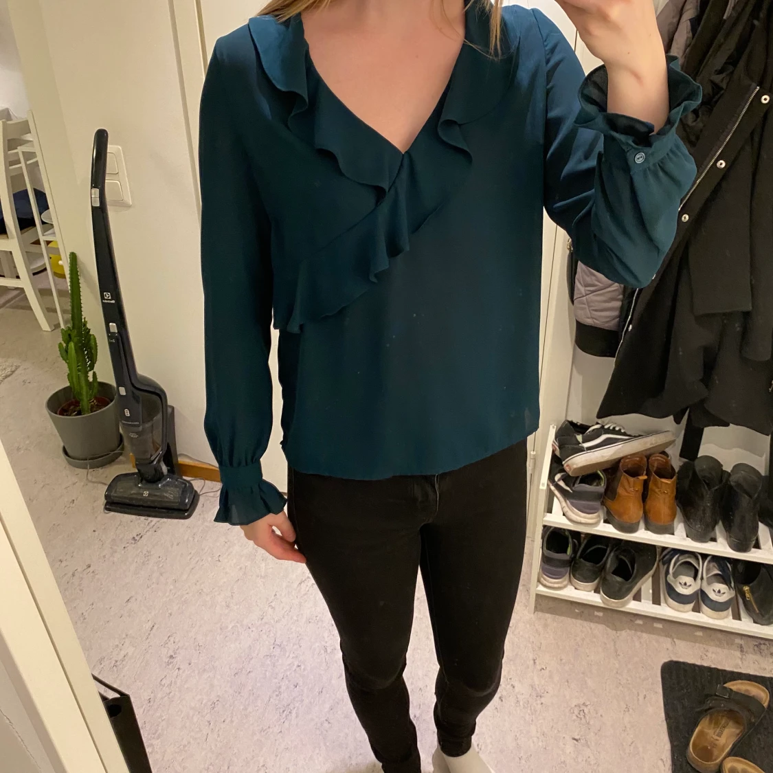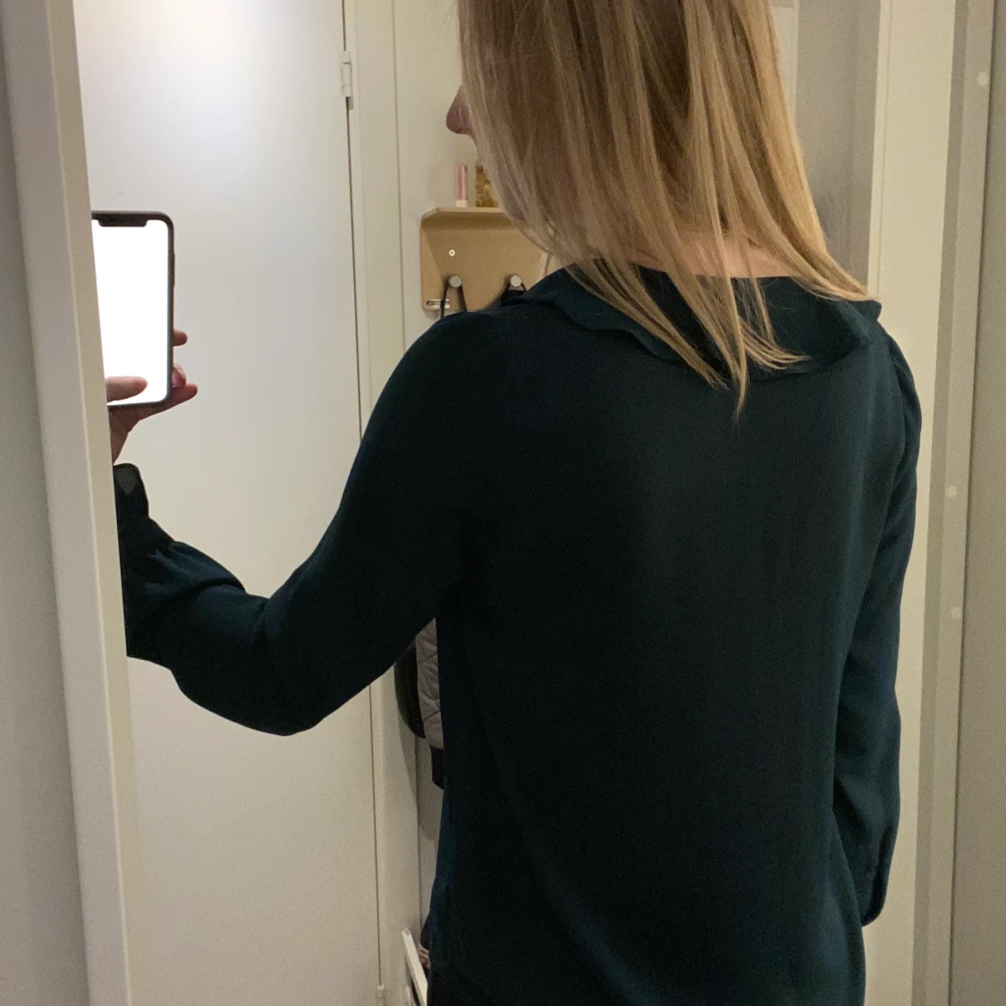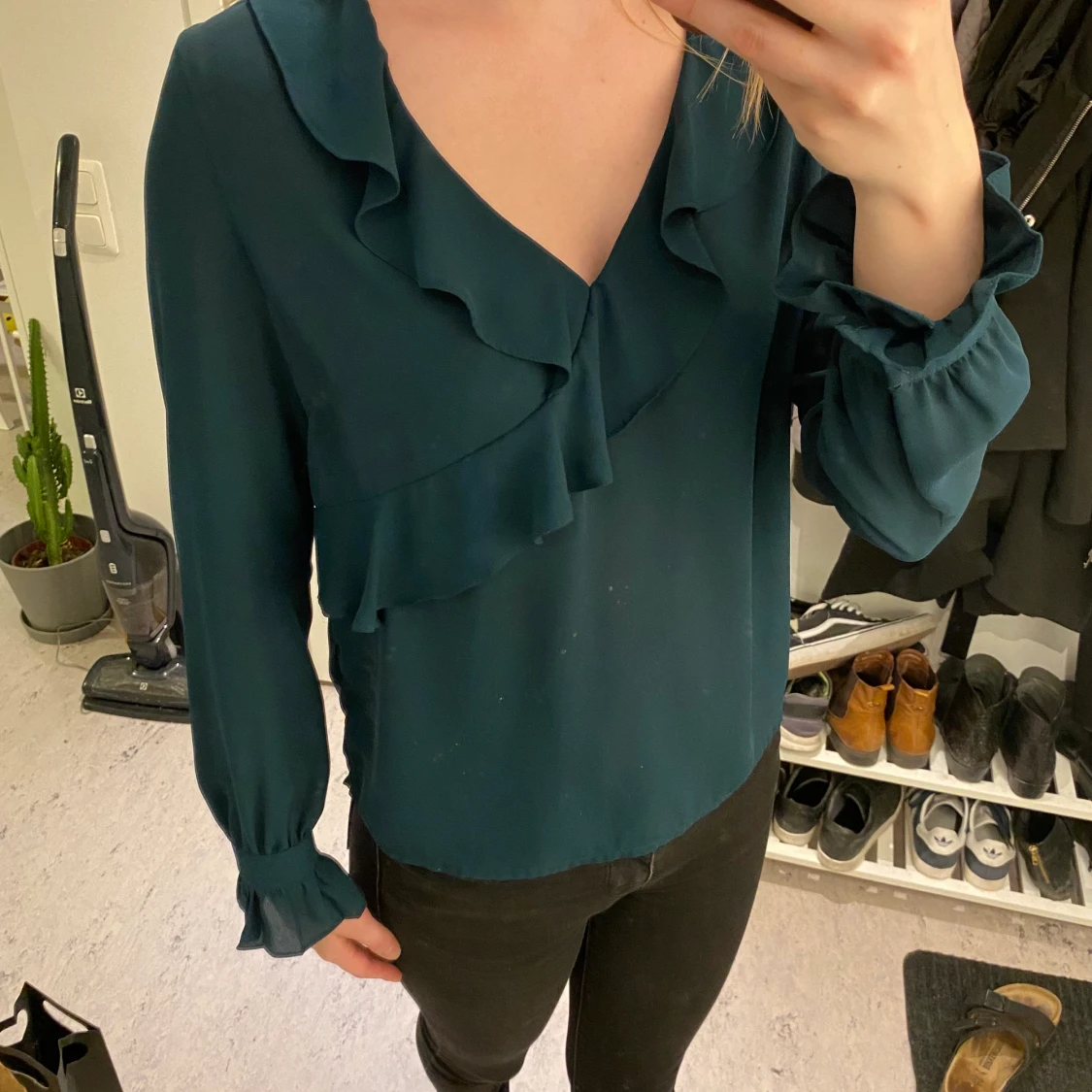 Mossgrön blus med volanger som inte används då den är för stor för mig.
