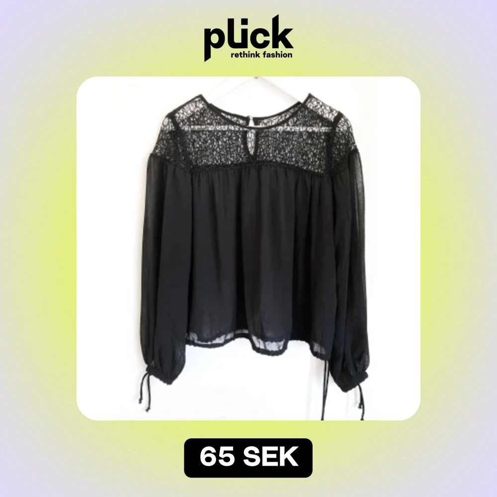 Svart chiffongblus med virkad överdel. Knytband i ärmslut och slutet av toppen, kan göra blusen mer eller mindre ballong-modell. Några lösa trådar i den virkade delen och det elastiska bandet i nacken är trasigt. Mått får ej plats - fråga gärna!