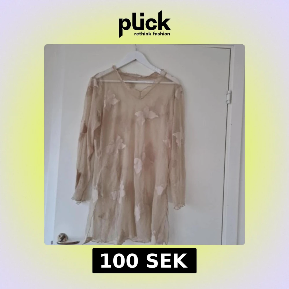Säljer en beige, transparent tunika med lång ärm och v-ringning. Tunikan har stora blommiga detaljer och en luftig, flowy passform. Perfekt för lager-på-lager eller som strandplagg.