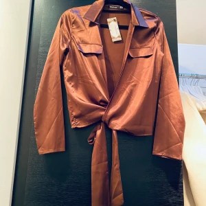 Satintop chokladbrun. Knyt i midjan. Knytes fram eller bak på ryggen. Går att knyta hårdare i midjan. Aldrig använd.