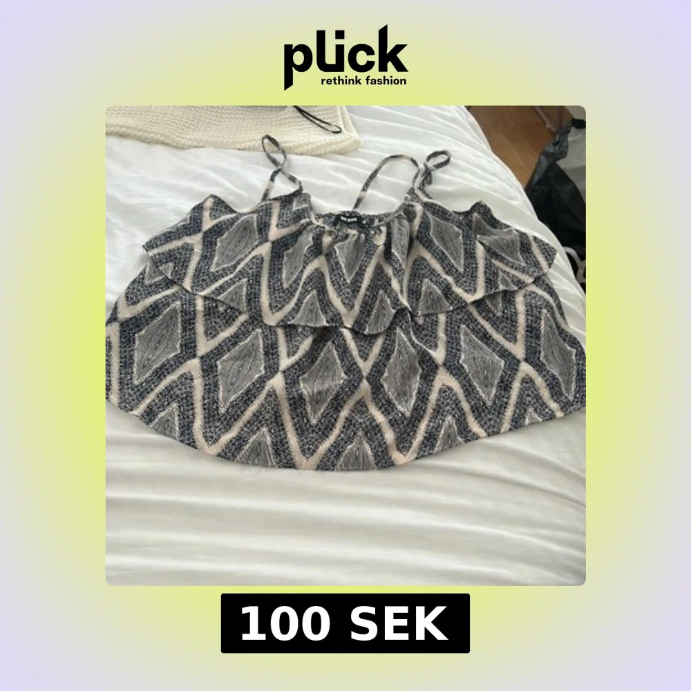 Säljer en snygg linnetopp från Bik Bok med grafiskt mönster i blåa och beige/vit. Toppen har tunna axelband och en volangdetalj framtill som ger en cool och luftig känsla.