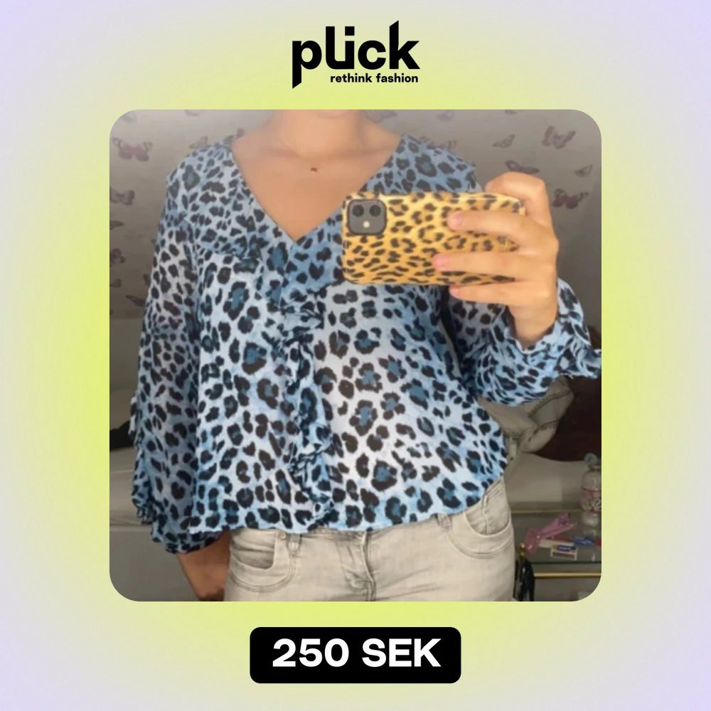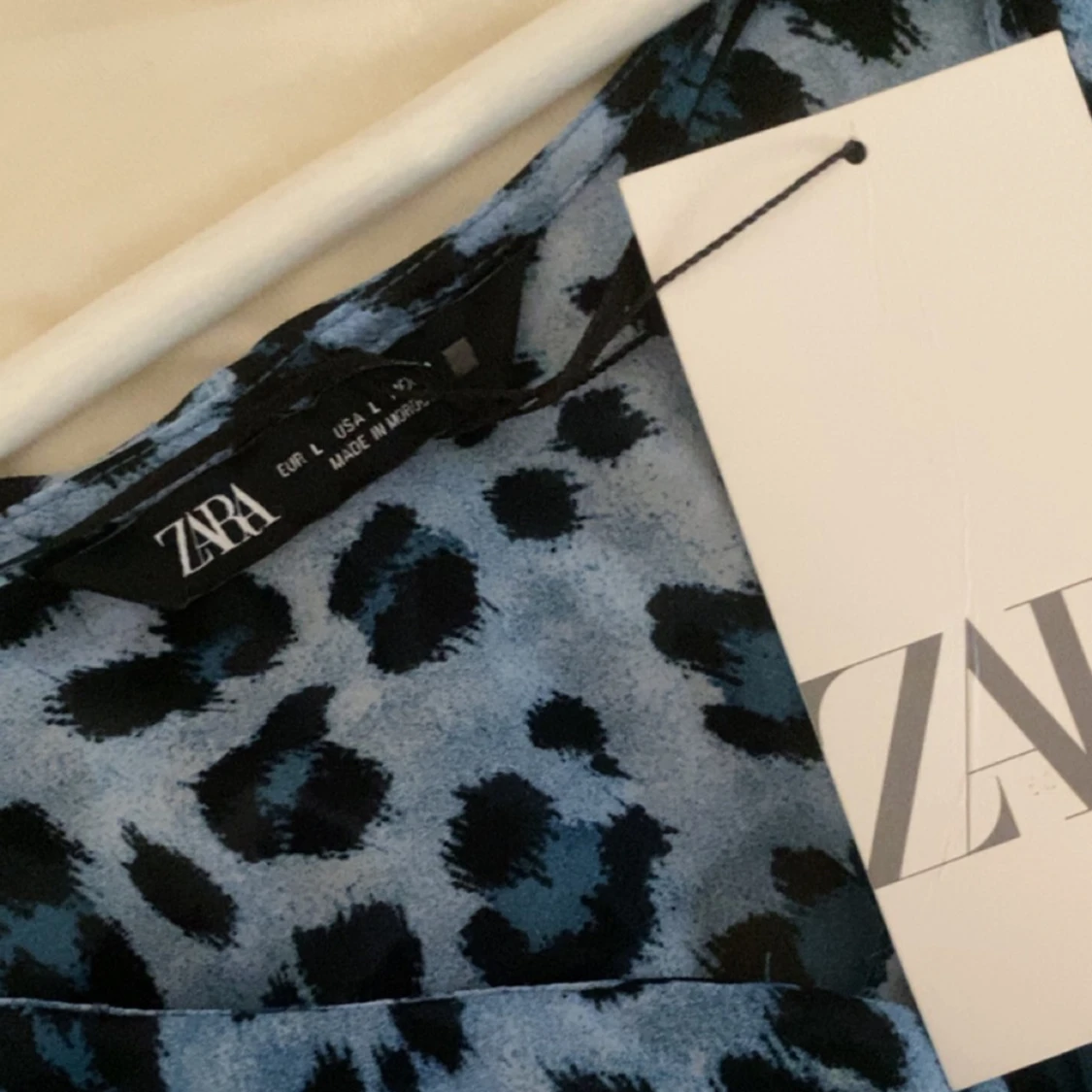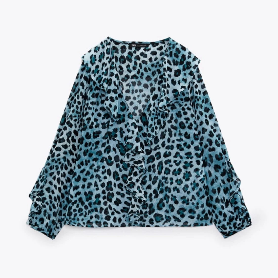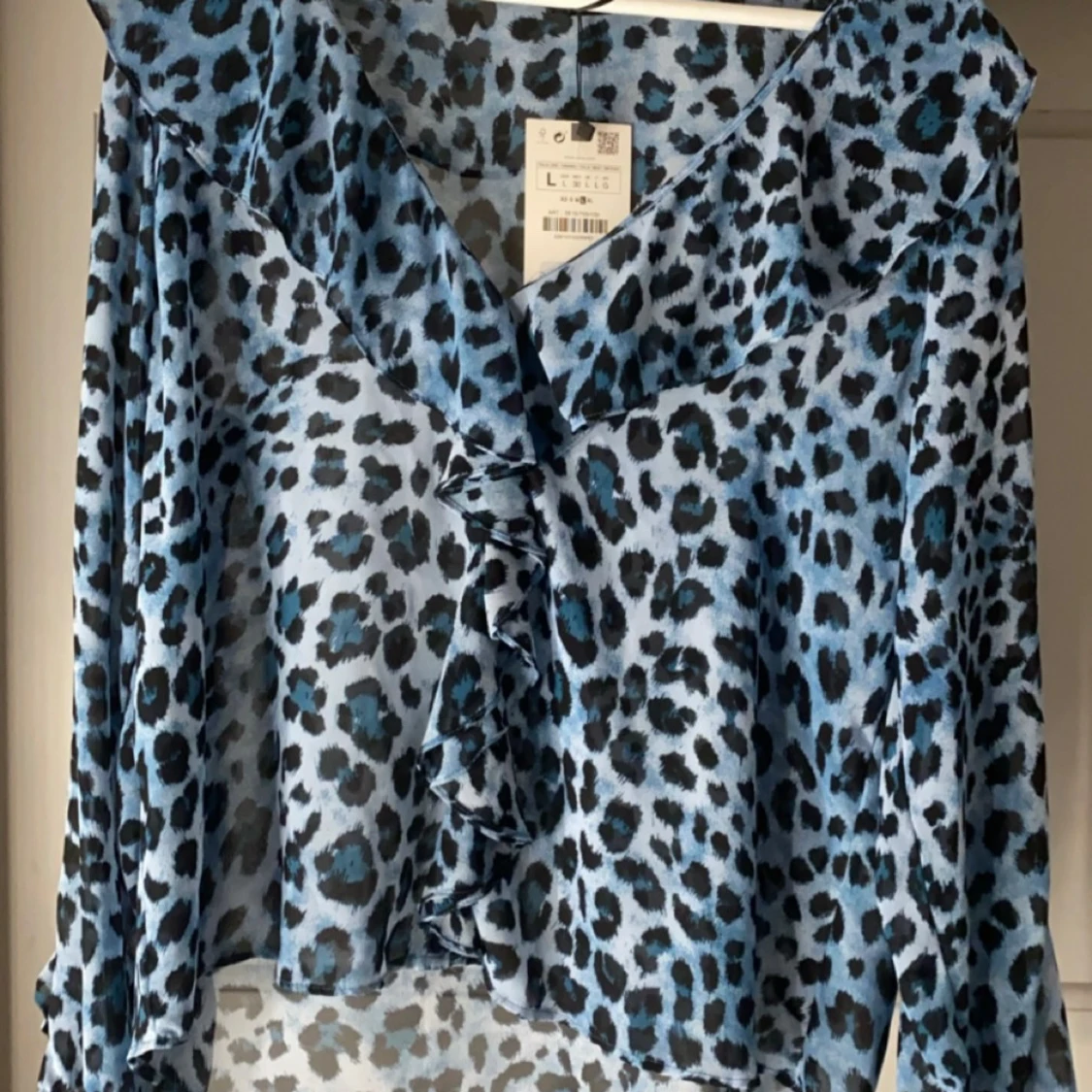 Superfin blå leopardmönstrad blus med volanger från Zara. Helt oanvänd med lappen kvar. Storlek L, men lite liten i storleken, passar S/M. Säljer då jag inte hann lämna tillbaka den.