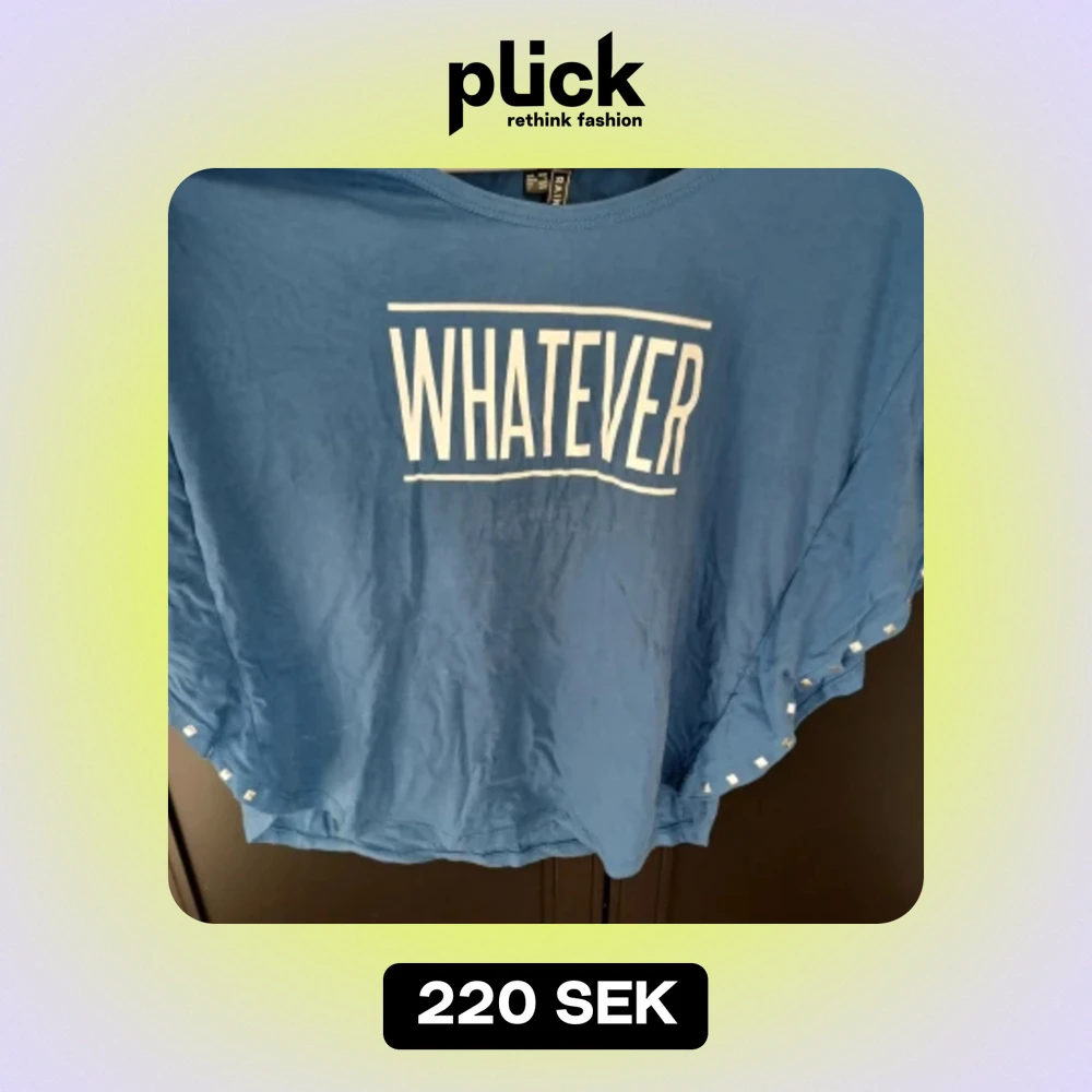 Blå tröja med trycket WHATEVER. Ärmarna är utsvängda men är igen sydda mot kroppen. Silver dekorationer i fram. Inte använt så mycket o säljer därför. Fint skick o inga fläckar. Behövs strykas annars inga fel.
