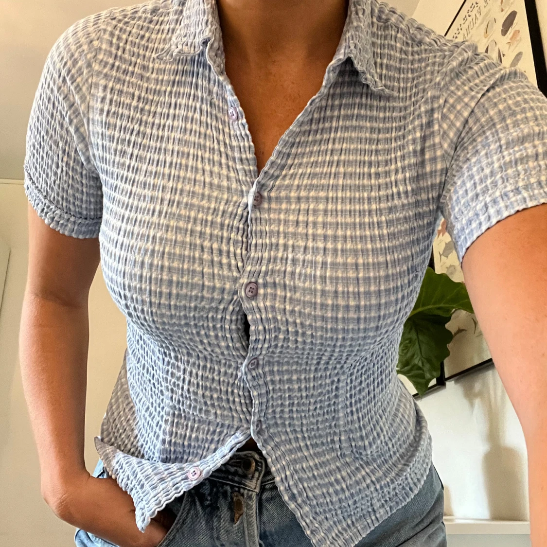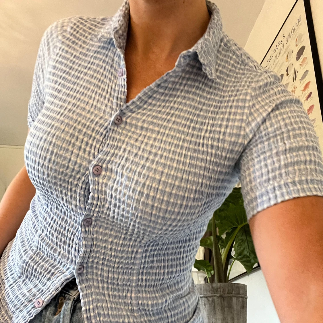 Figurnära skjorta i ljusblå/vit med struktur och knappar. Frakt tillkommer på 58kr 🫶🏻