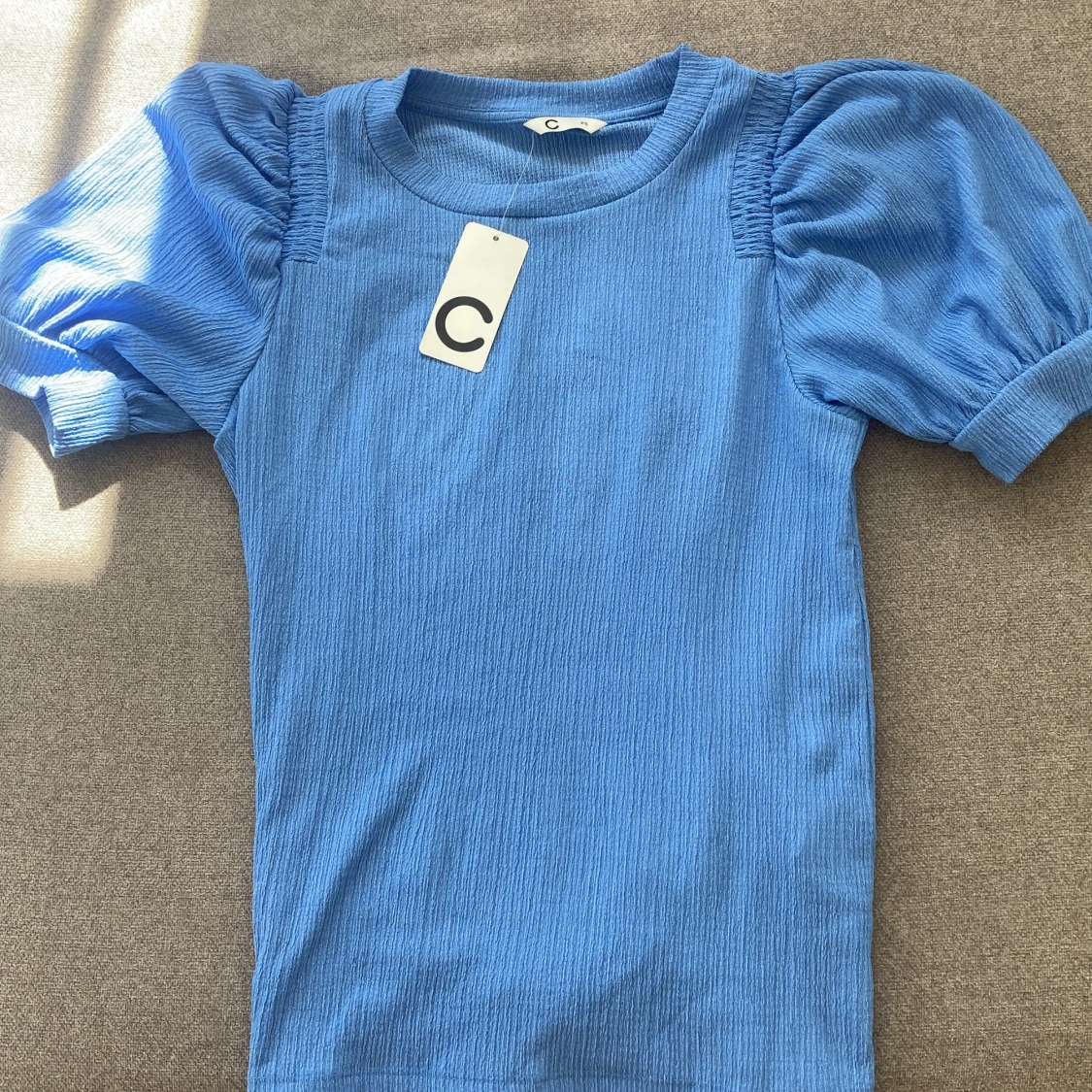 Blå puffärmad T-shirt från Cubus , aldrig andvänd. I storlek xs smarlt ribbad i bra skick. Säljer pgd att den inte andvändts.