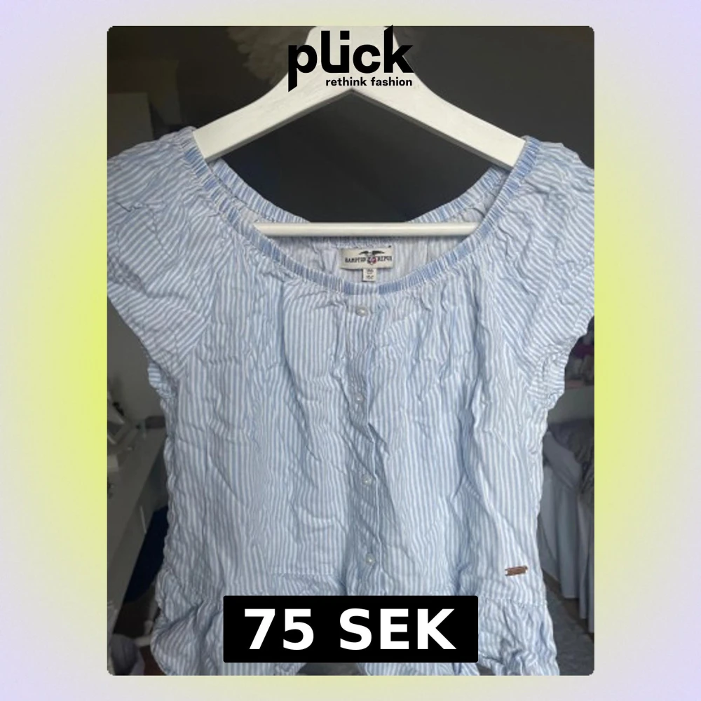 Säljer en söt blus från Hampton Republic i storlek 146/152. Blusen är ljusblå och vit med smala ränder, har korta ärmar och knappar framtill. Rundad hals och volangdetaljer längst nere. Om ni vill ha bättre bilder med tanke på att blusen är lite skrynklig är det bara att säga till! 💙🤍Pris går att diskutera!