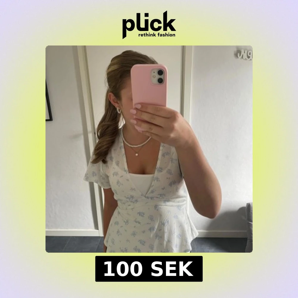 Supersöt vit blus med ljusblått blommönster från Gina Tricot. Modellen har v-ringning, korta ärmar och knytband i midjan för en snygg passform. Perfekt för vår och sommar, lätt och luftig i bomullsmix. Den är som ny o har bara används en gång.